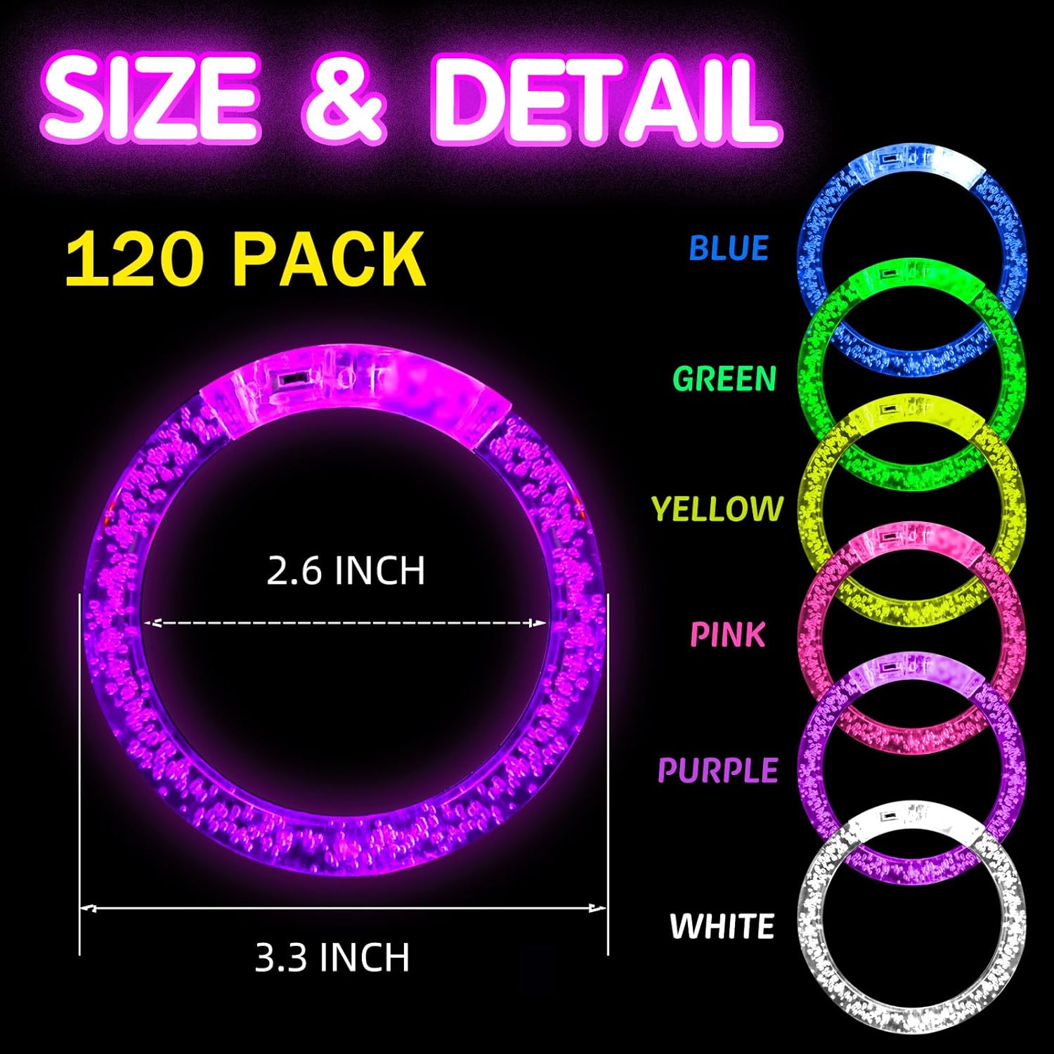 - 【90PCS Colourful Glow In The Dark Bracelets】LED glow in the dark sticks bracelets available in 6 different colors: purple, pink, clear, yellow, green and blue. Each bracelet come with special LED lights and shining in a rhythm, funny visual appeal, and diffusing light through inside bubbles will bring extraordinary visual experience as well. Wearing these novelty gear just like immersed in a romantic, dreamy and passionate atmosphere in the night party supplies
