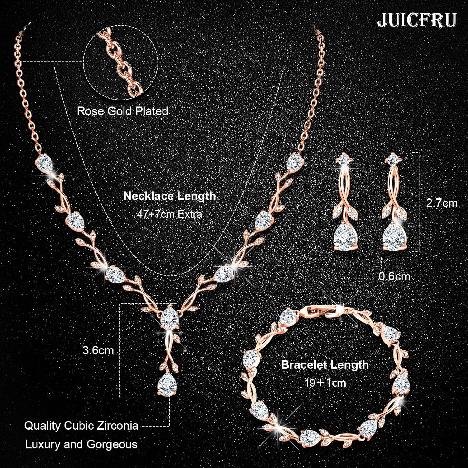 - High Quality Material: This flower wedding jewelry set for bride is made of 14K rose gold plated and crystal cubic zirconia. The size of this drop dangle earring is 2.7cm * 0.6cm. The necklace & bracelet length are 45+4cm & 19cm.