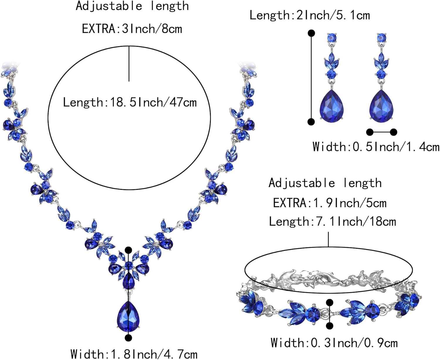 - Specifications and Size: Necklace: Pendant Size:14.1*1.8 in; Chain Length (Adjustable): 18.5-21.5 in. Earrings (Pierced): 2*0.5 in.Bracelet Length:7.1-9in,Width:0.3in .Total Weight:59.7g.