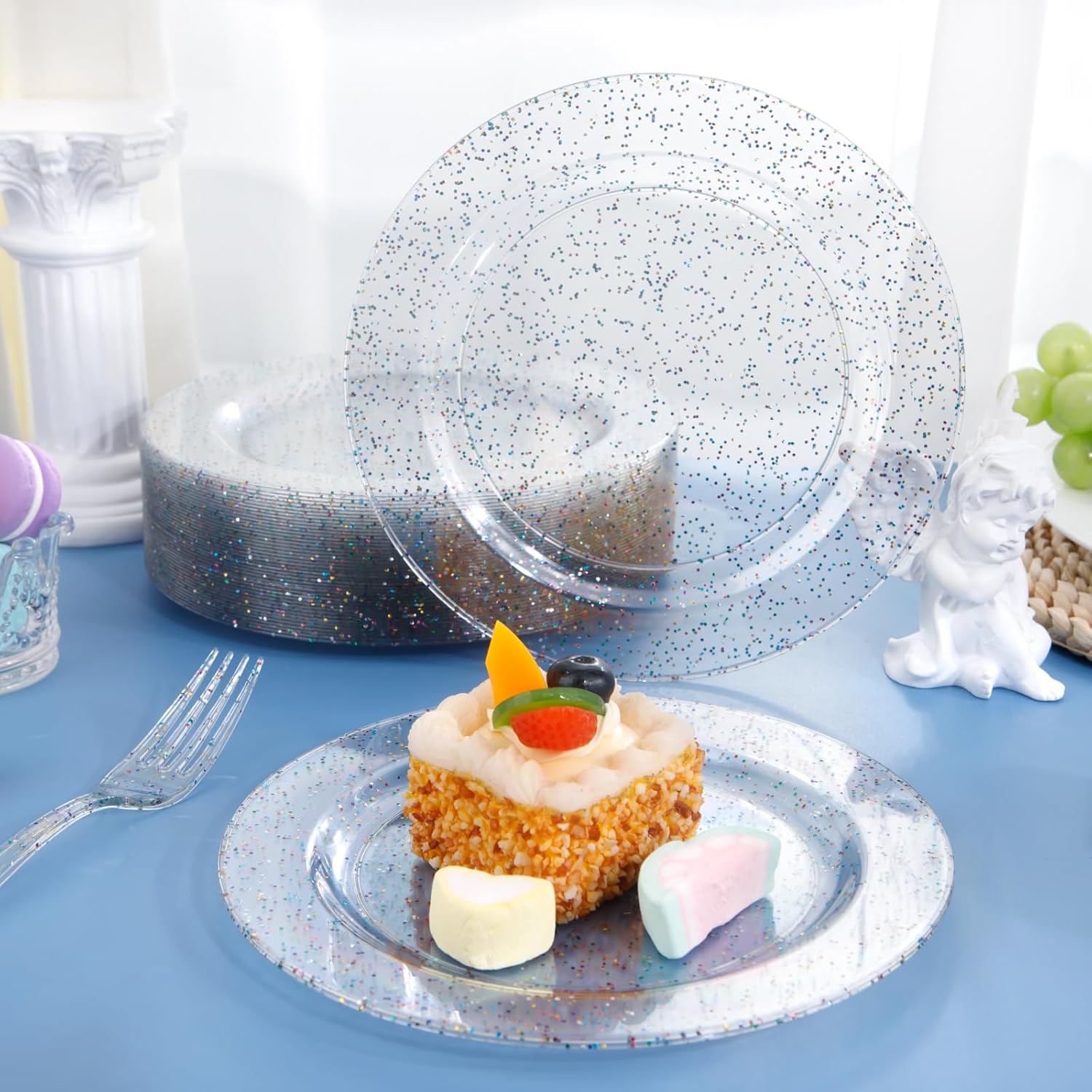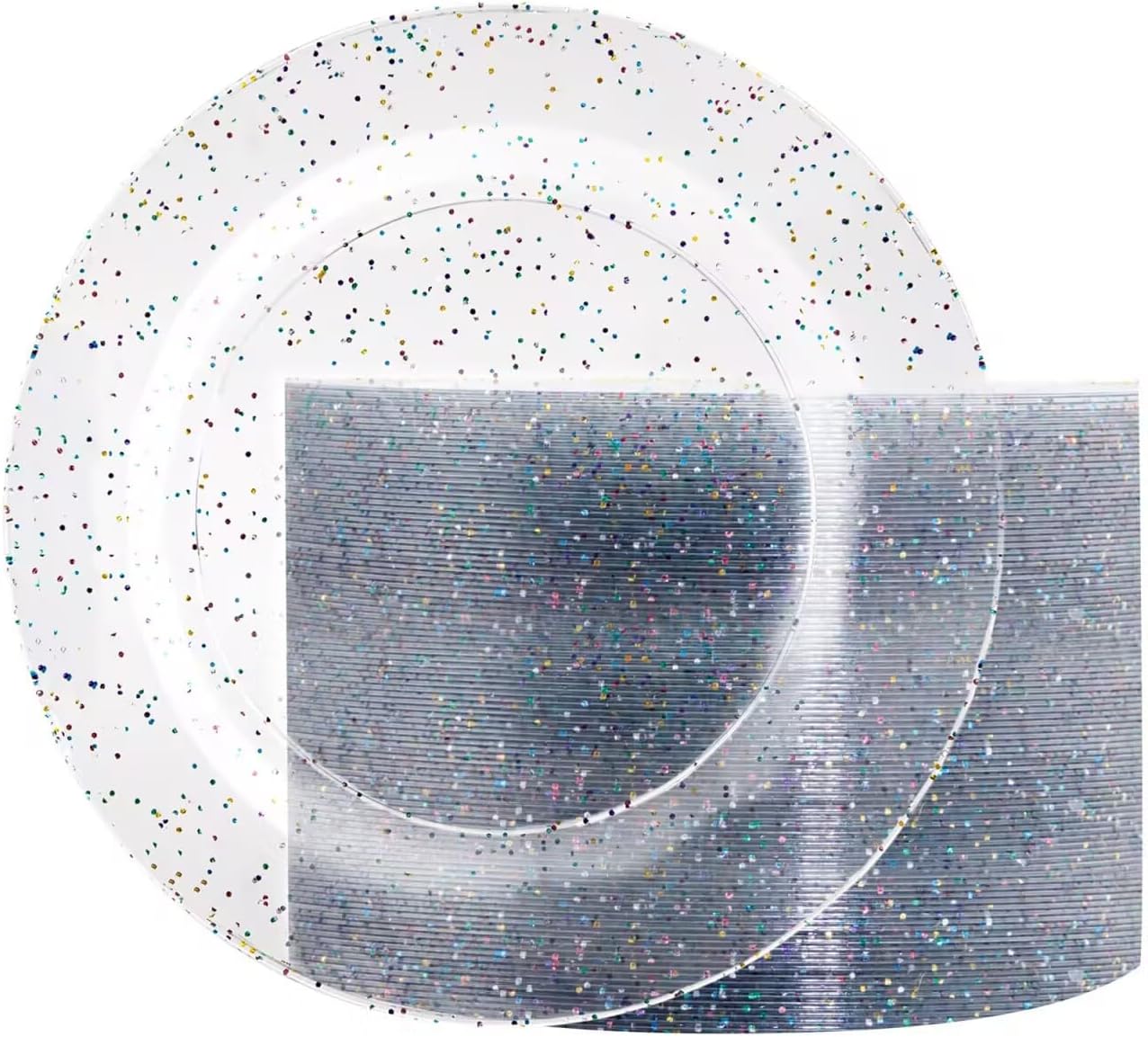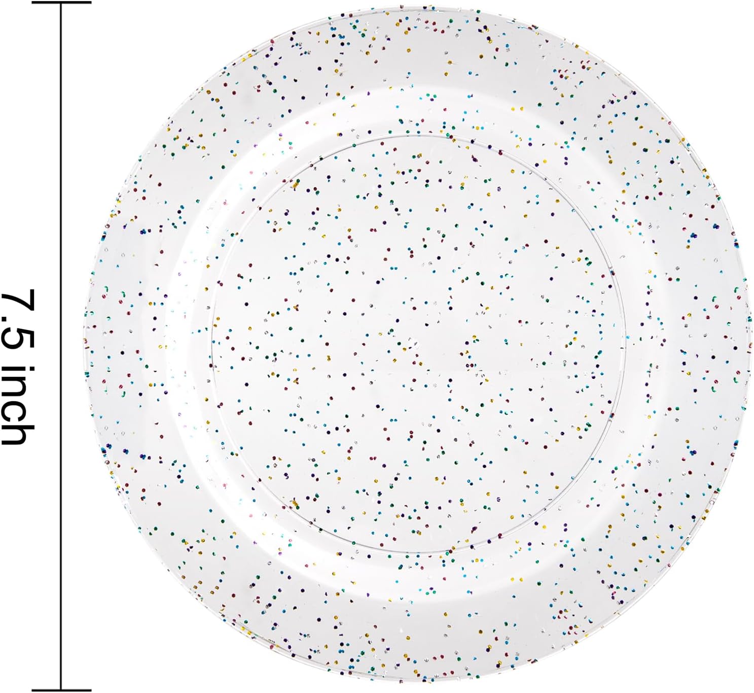 Liacere 100Pieces Colored Glitter Plastic Plates- Clear- Dessert Plates -7.5inch Glitter Plastic Dinner Plate Perfect for Wedding & Party & Birthday&Halloween