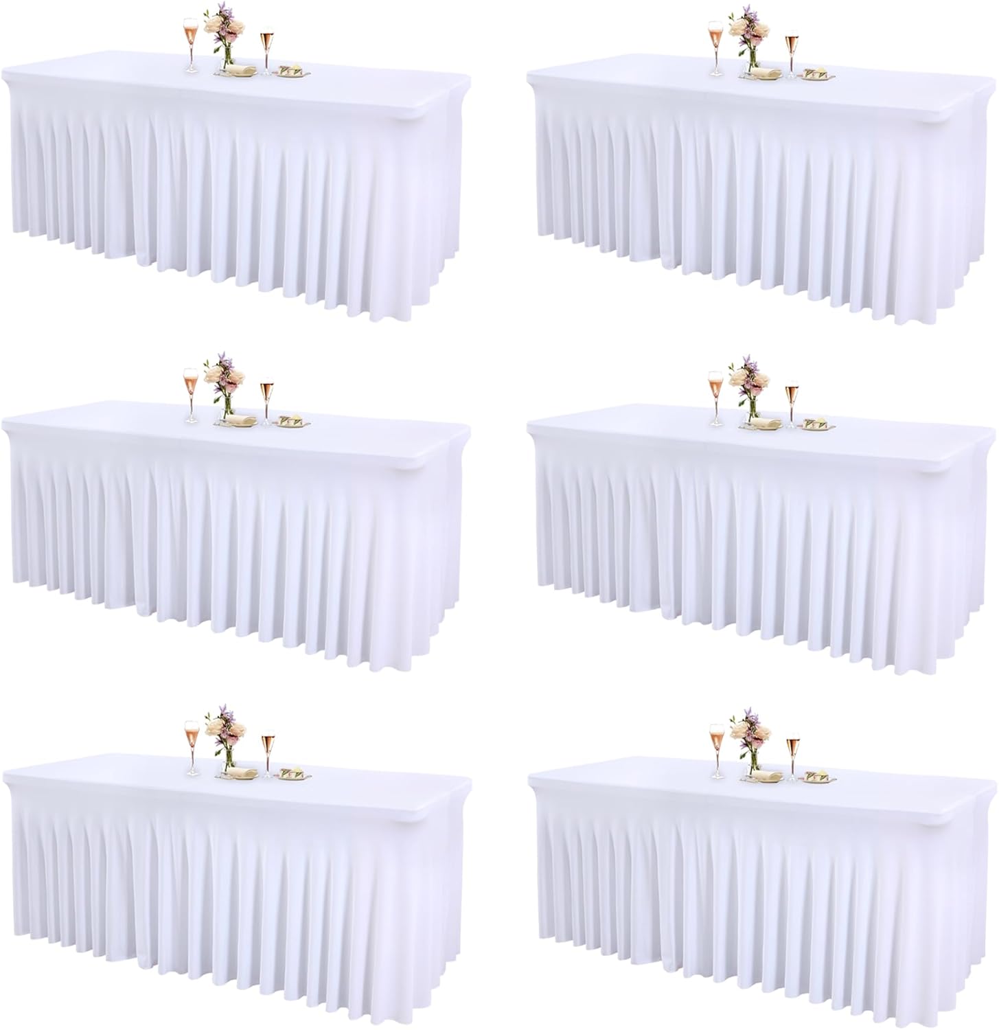 6 Packs White Table Clothes for 6 Foot Rectangle Tables, One-Piece Wrinkle Resistant Stretch Spandex Table Covers with Skirt for Event Banquet Wedding Birthday Party
