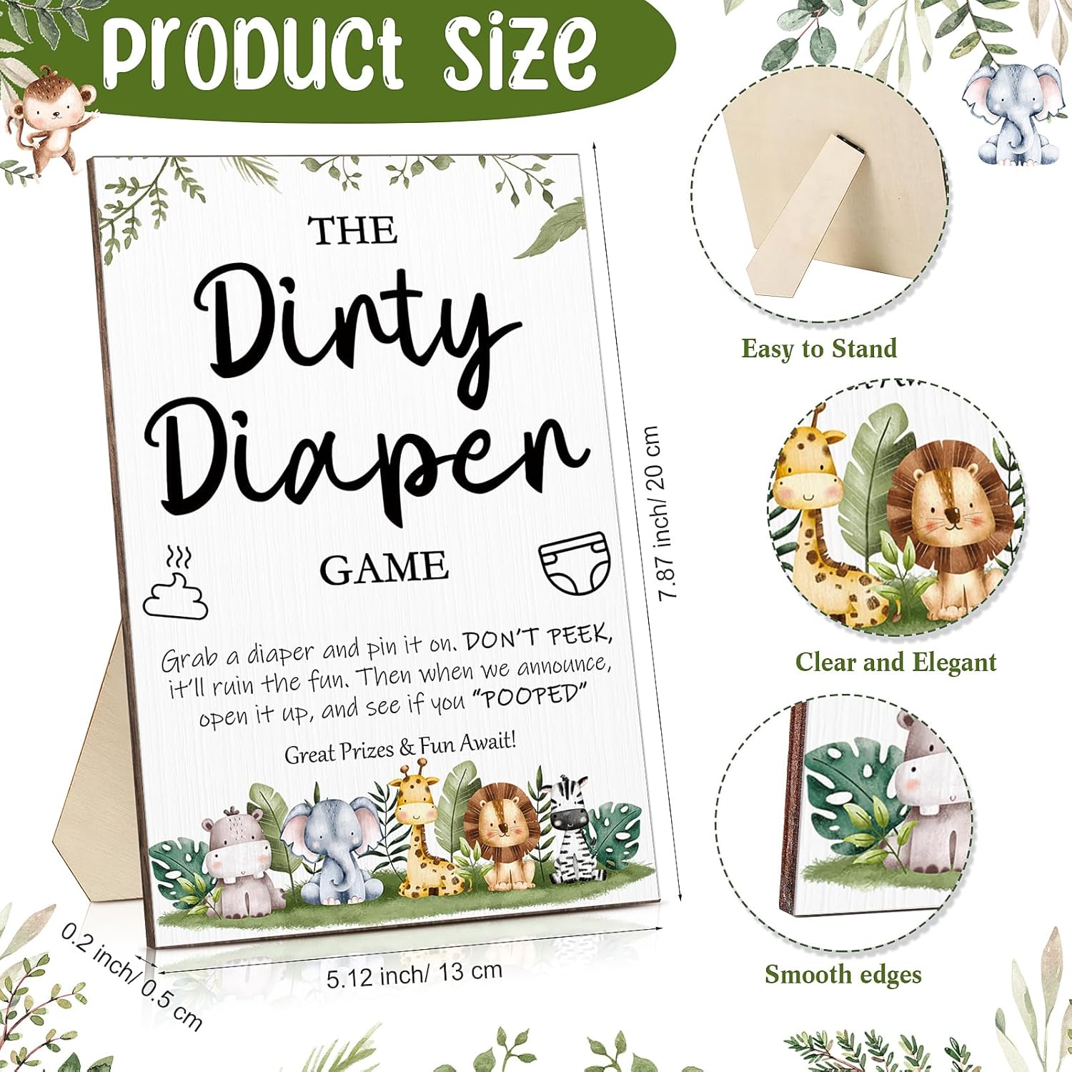 - Size for Easy Using: the animals wooden baby shower game decor is approx. 5.12 x 7.87 x 0.2 inches/ 13 x 20 x 0.5 cm, with a holder on the back, easy to stand on the table; The mini felt diapers are approx. 3.15 x 2.36 inches/ 8 x 6 cm, lightweight and compact, easy for you to grasp during the party game