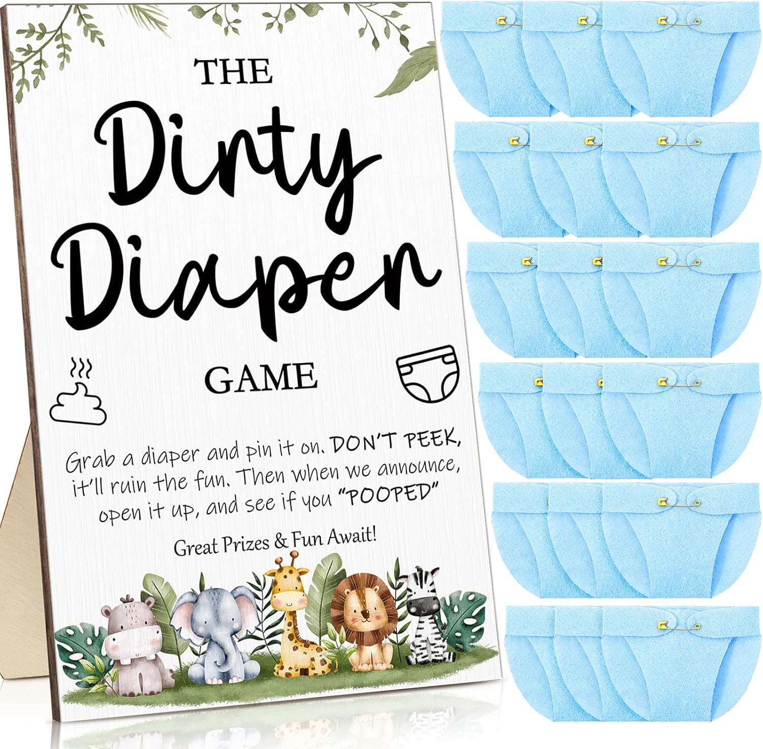 Roowest 51 Pcs Dirty Diaper Baby Shower Games Funny Wooden Sign with 50 Pcs Mini Diapers Cute Felt for Gender Reveal Party Baby Shower(Animals Blue)