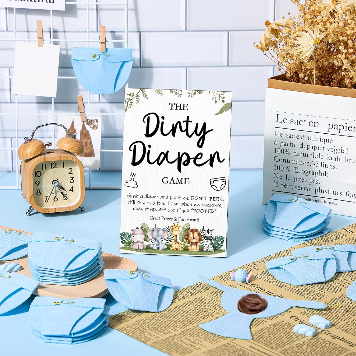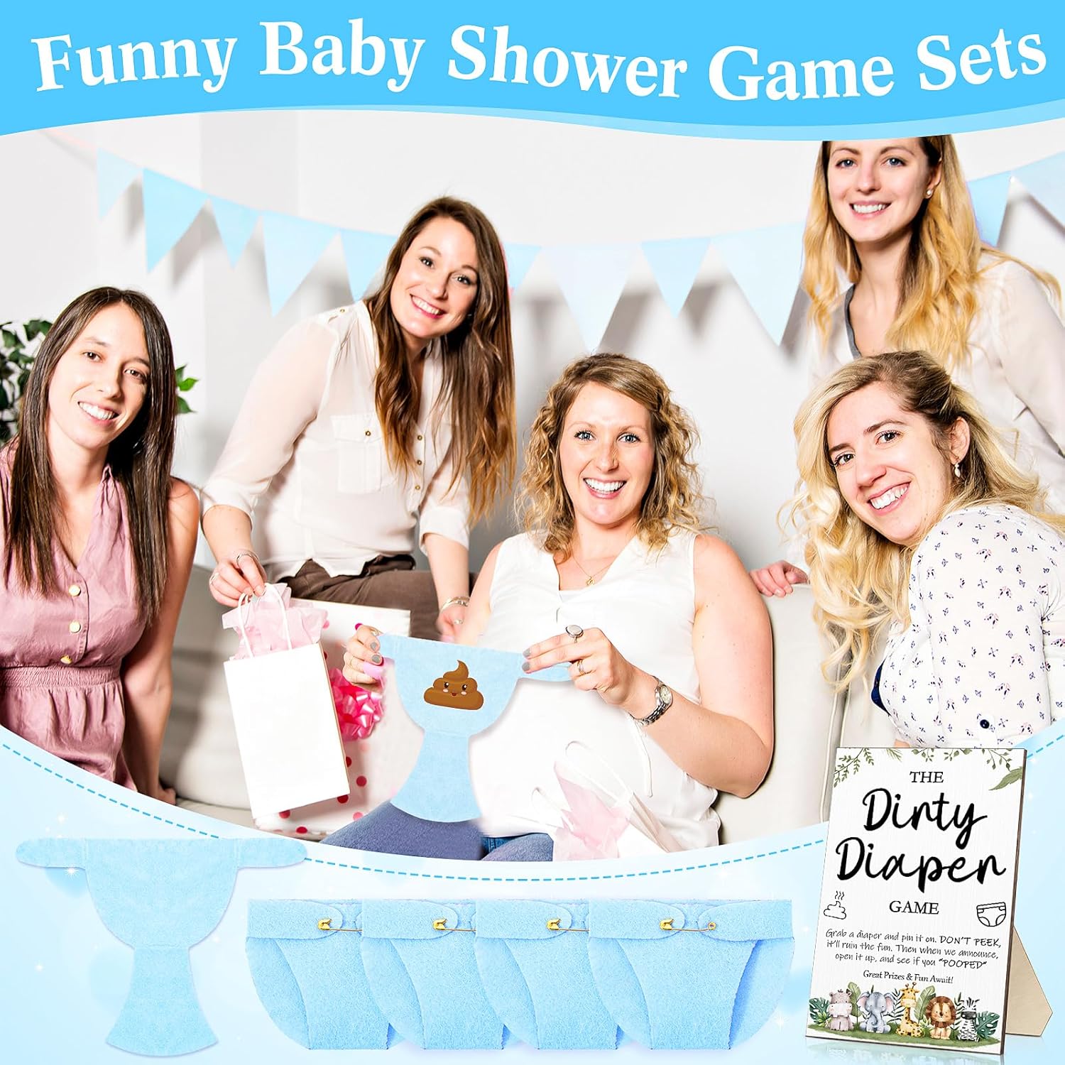 - Dirty Diaper Baby Shower Games Sets: we will provide you with 1 piece wooden baby shower games sign and 50 pieces of blue felt diapers, 51 pieces in total, useful for your baby shower parties and enough to share with others
