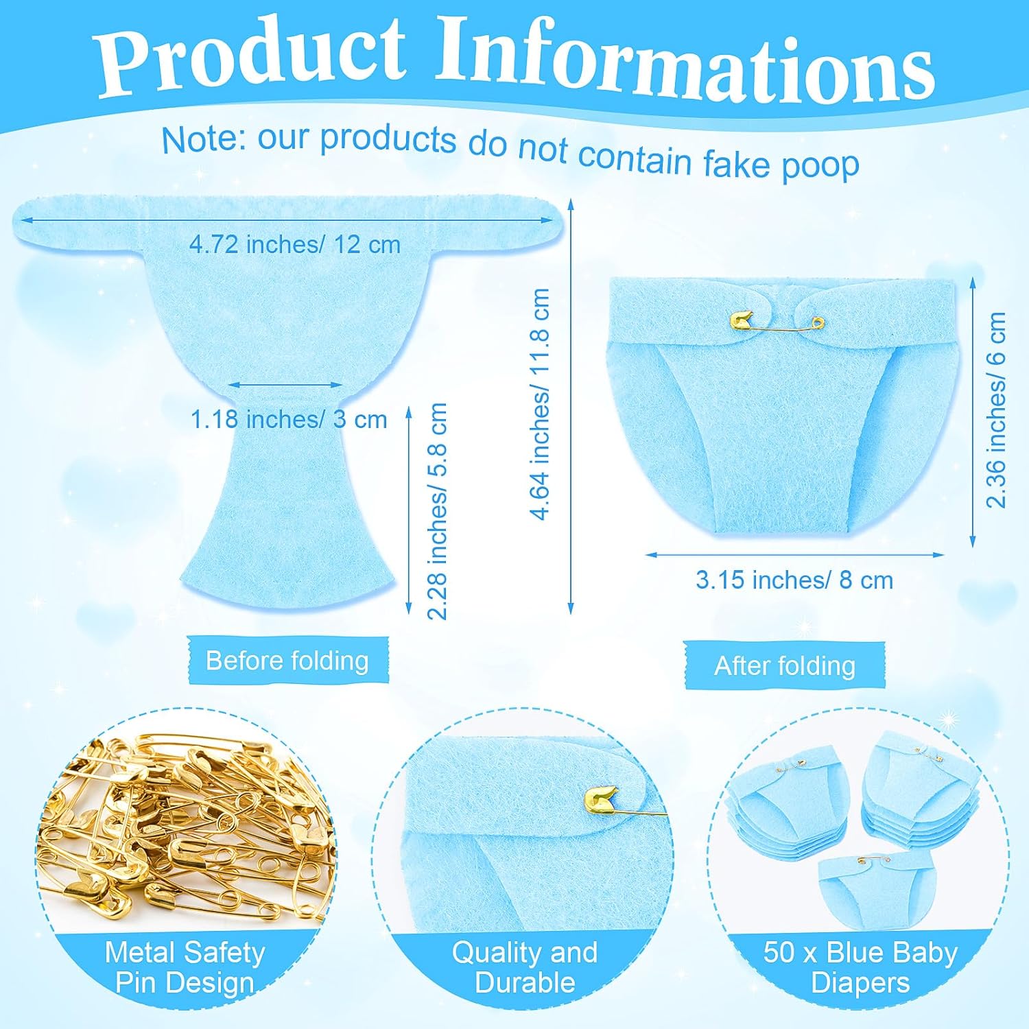 - Ideal Party Accessories: these baby shower party favors are suitable for gender reveal party, baby shower party, and more, and you can also use them as table decors; The blue felt diapers for baby shower can make your guests more joyful, leaving them a deep impression