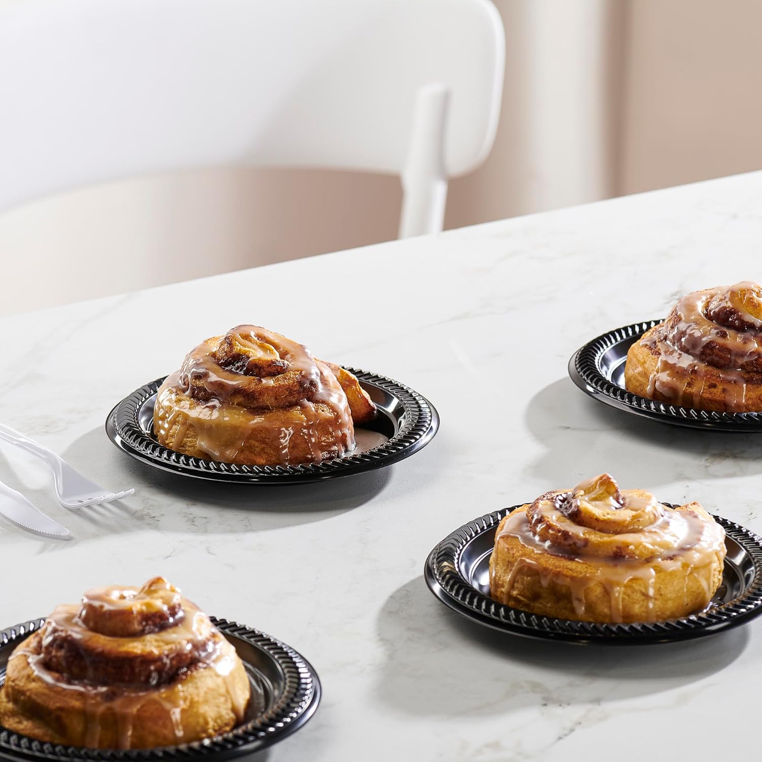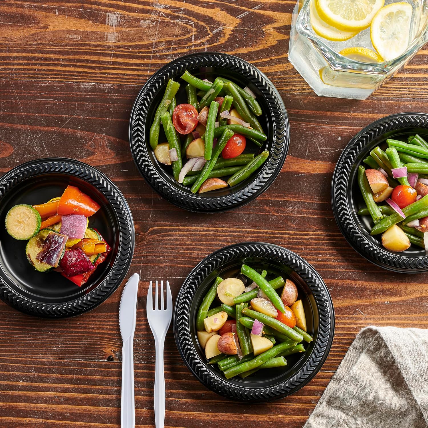 - Black plastic dishes brings together your parties and events décor with a modern and up to date aesthetic. These plastic plates are ideal for use with children or for outdoor gatherings to avoid any dishes from breaking or shattering.