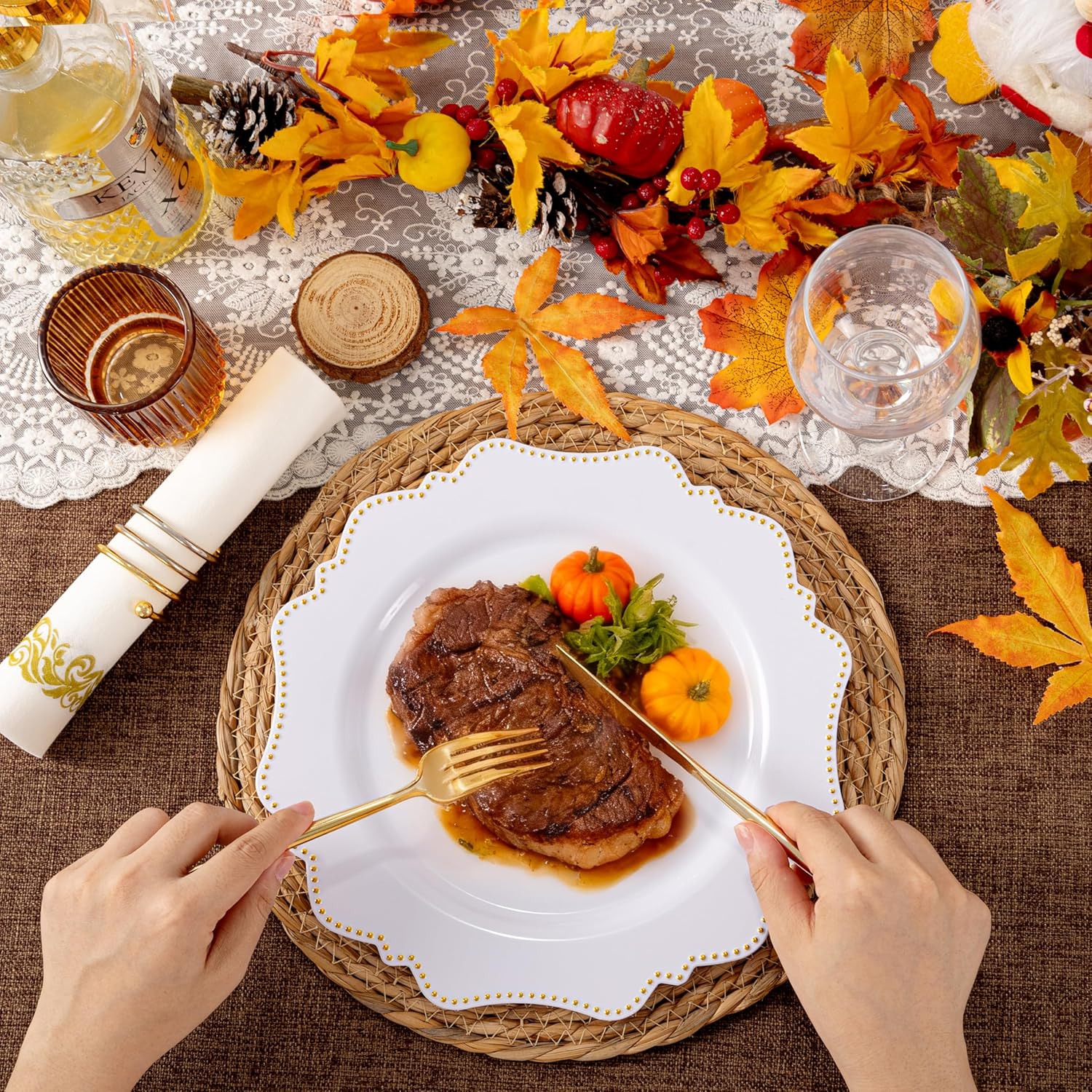 - PREMIUM QUALITY: These Gold Rim Plates for Parties are Heavy-duty, Durable, and Sturdy, which will not easily bend or crack. Unlike paper plates, high-quality plastic ensures plates don't crumble with soup. The Gold Plastic Silverware and Cups also not break easily. The Napkin is Soft and absorbent for hands mouth wiped or any spills around.