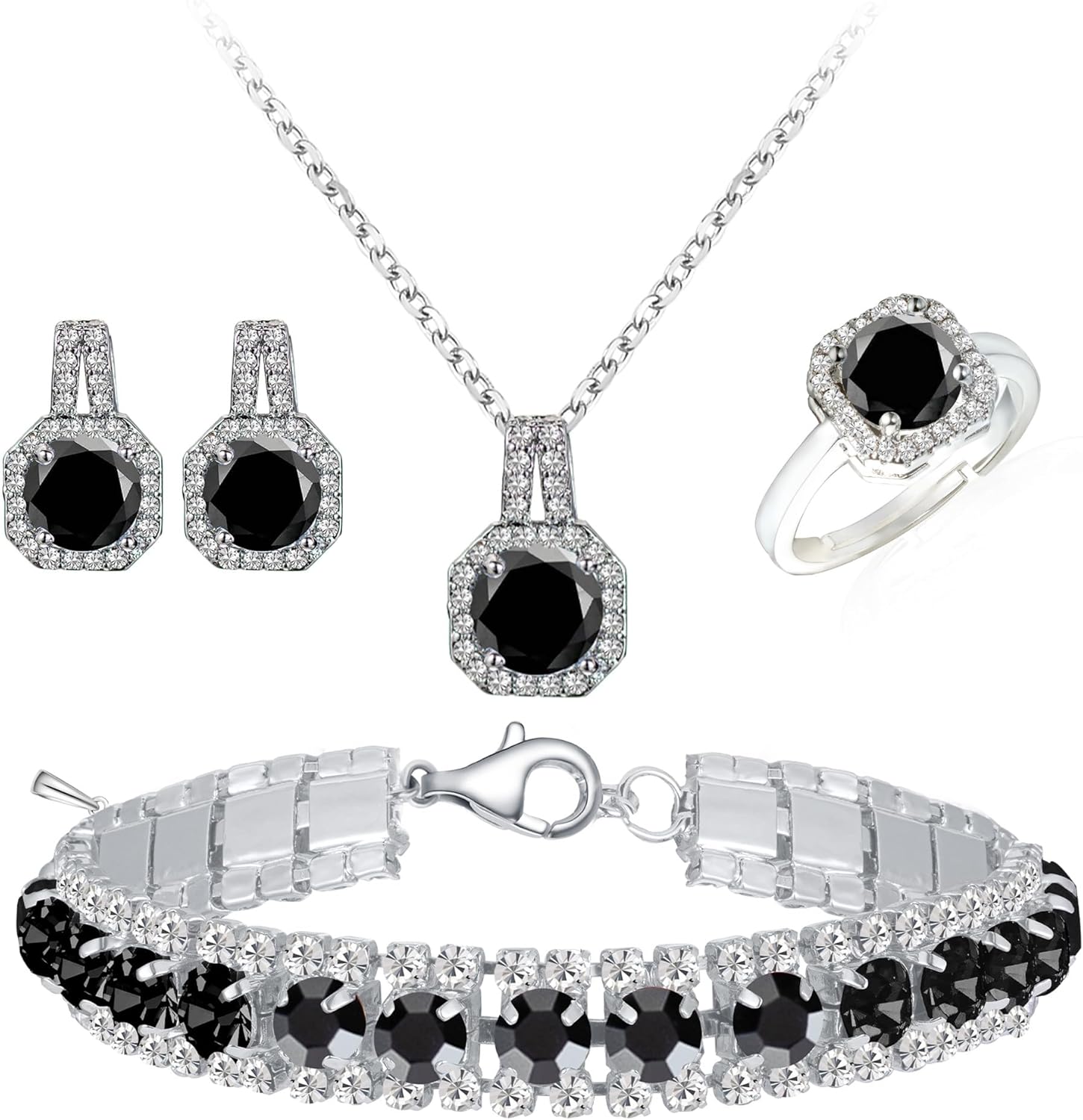4pcs Cubic Zirconia Wedding Jewelry Sets for Bride Bridesmaid Cubic Zirconia Pendant Necklace Earrings Link Tennis Bracelet Open Ring Set for Women