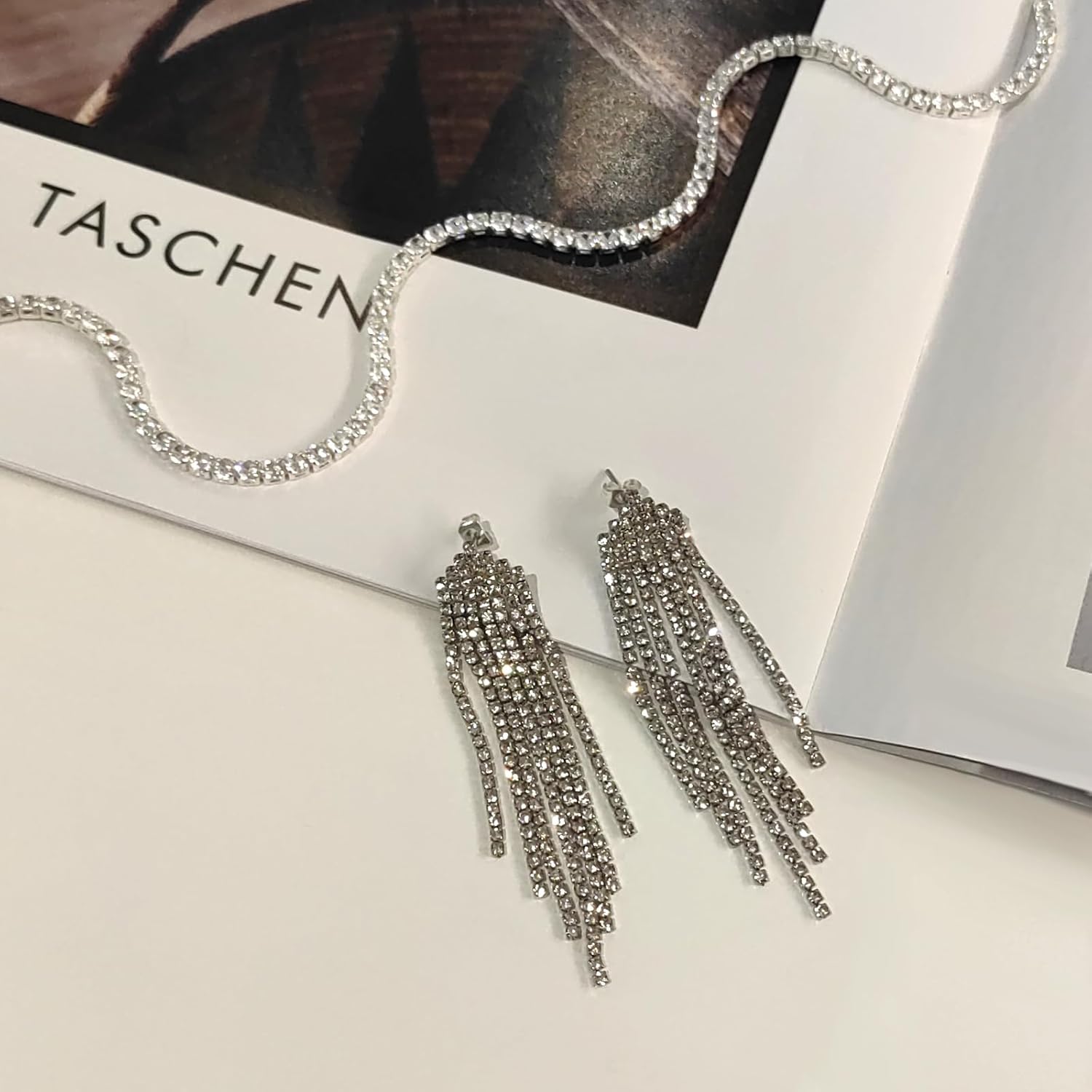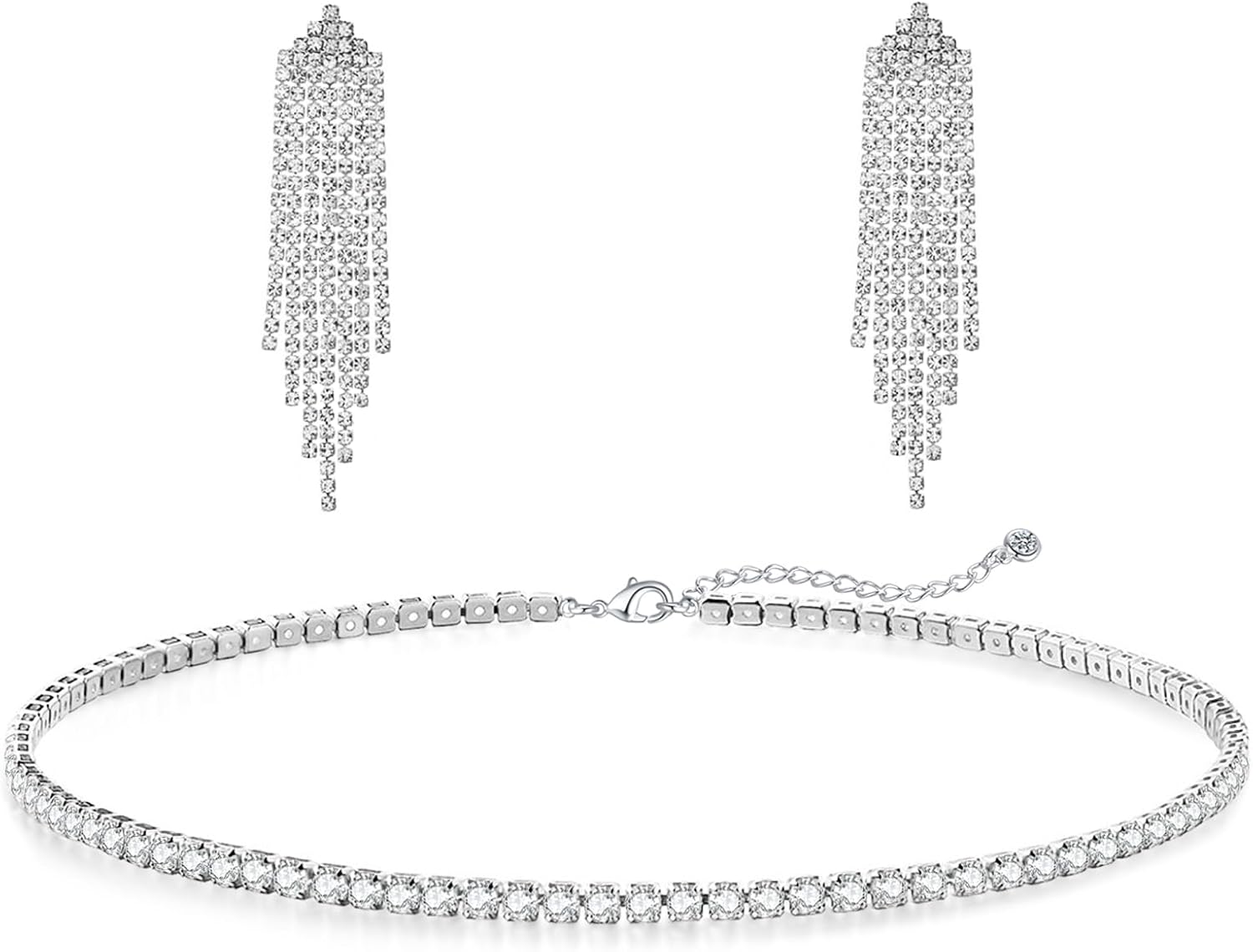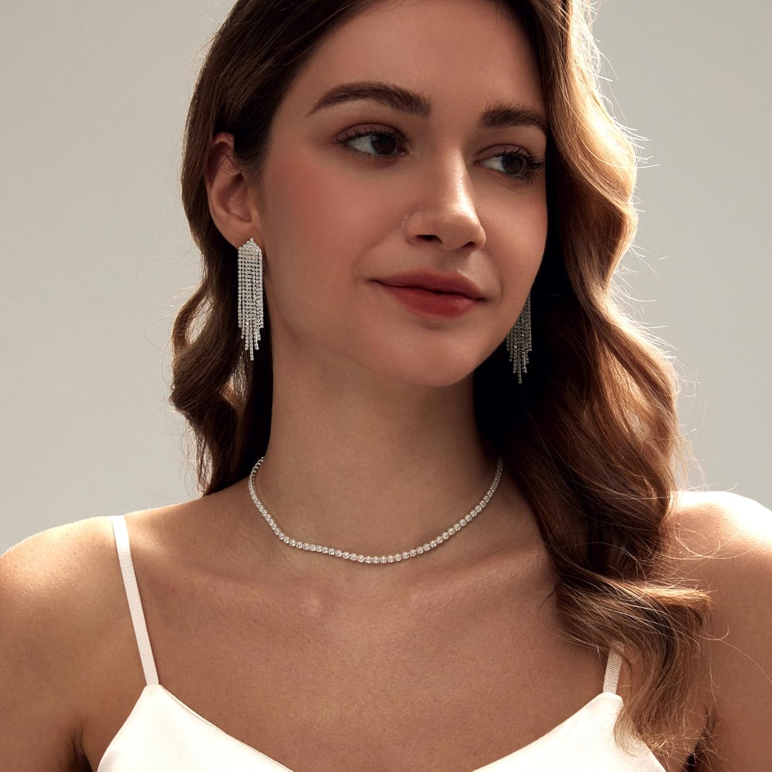 - Jewelry Set - Sterling Silver Rhinestone tennis necklace with Rhinestone Earrings Dangling for Women, will not fede or irritate your skin.