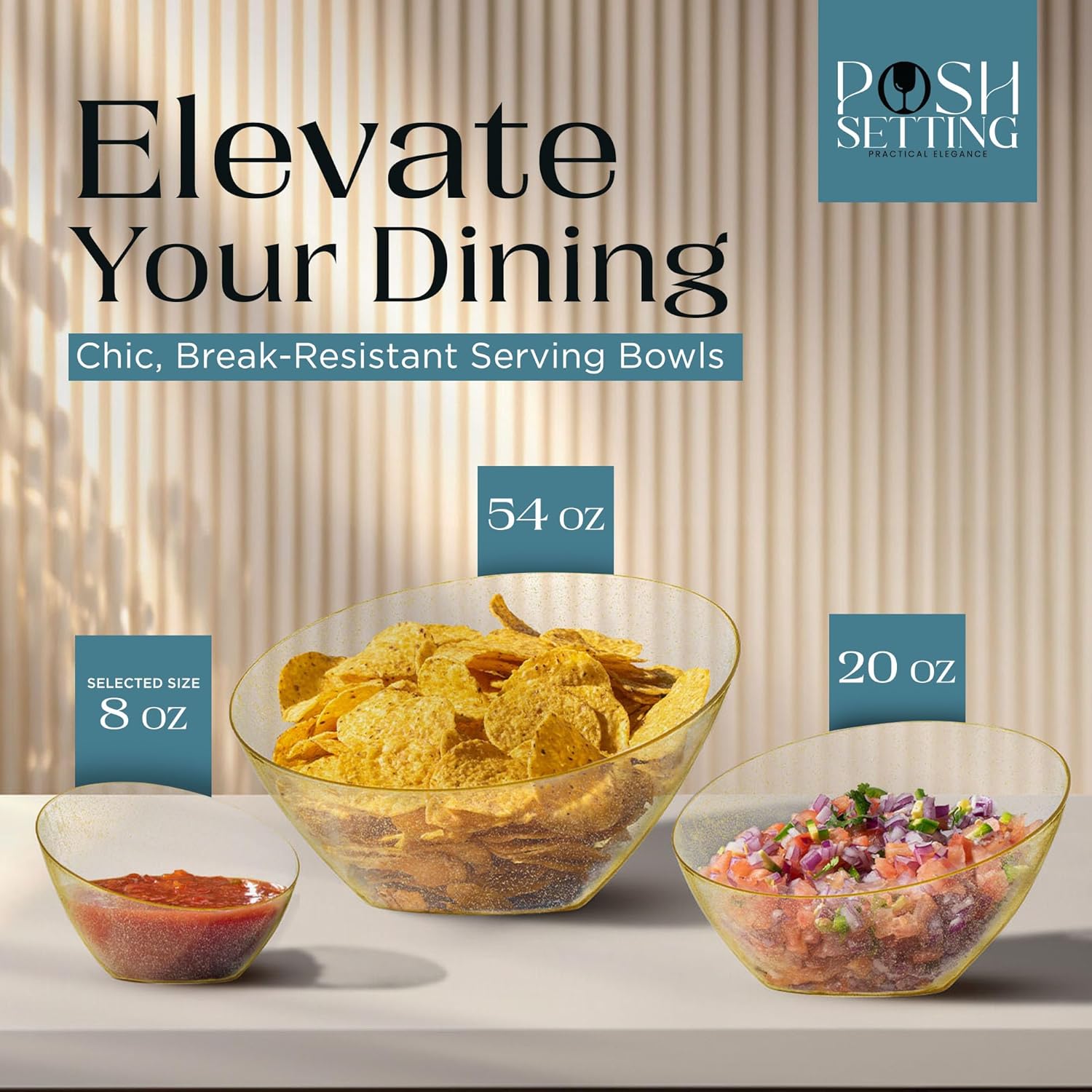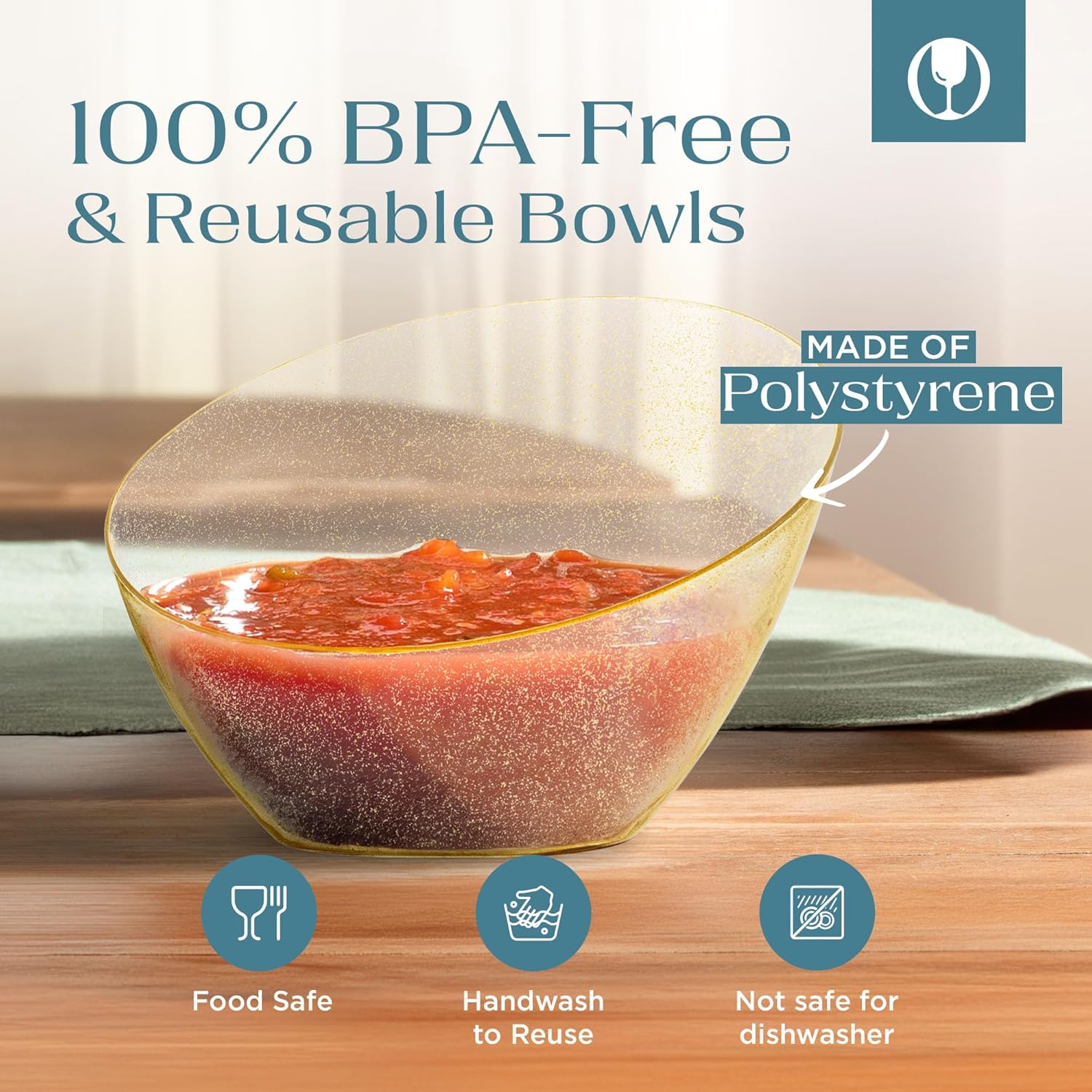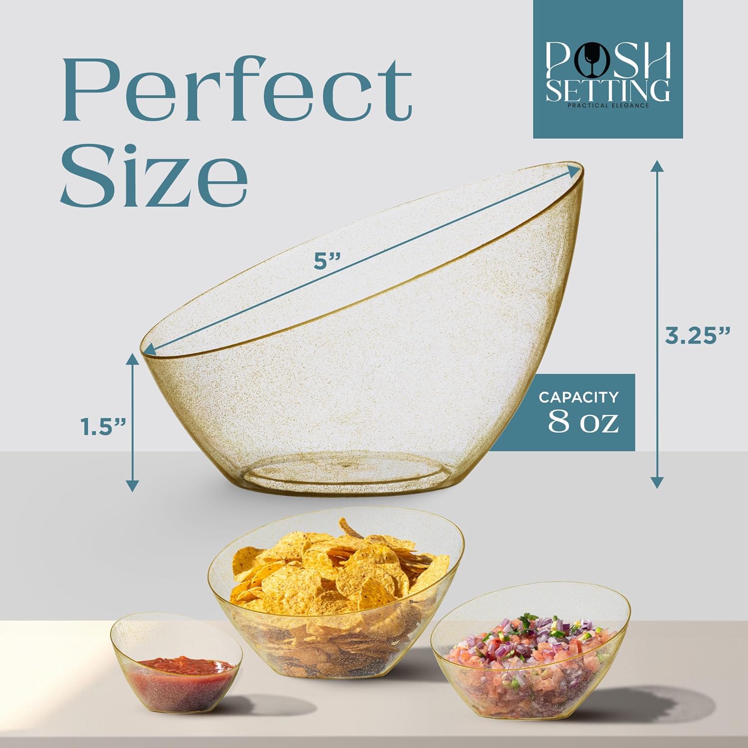 Posh Setting Gold Plastic Serving Bowls - Angled, Disposable for Chips, Candy, Salad, Fruit - Wedding and Party Table - Gold Glitter, 8 OZ, 5 Pack