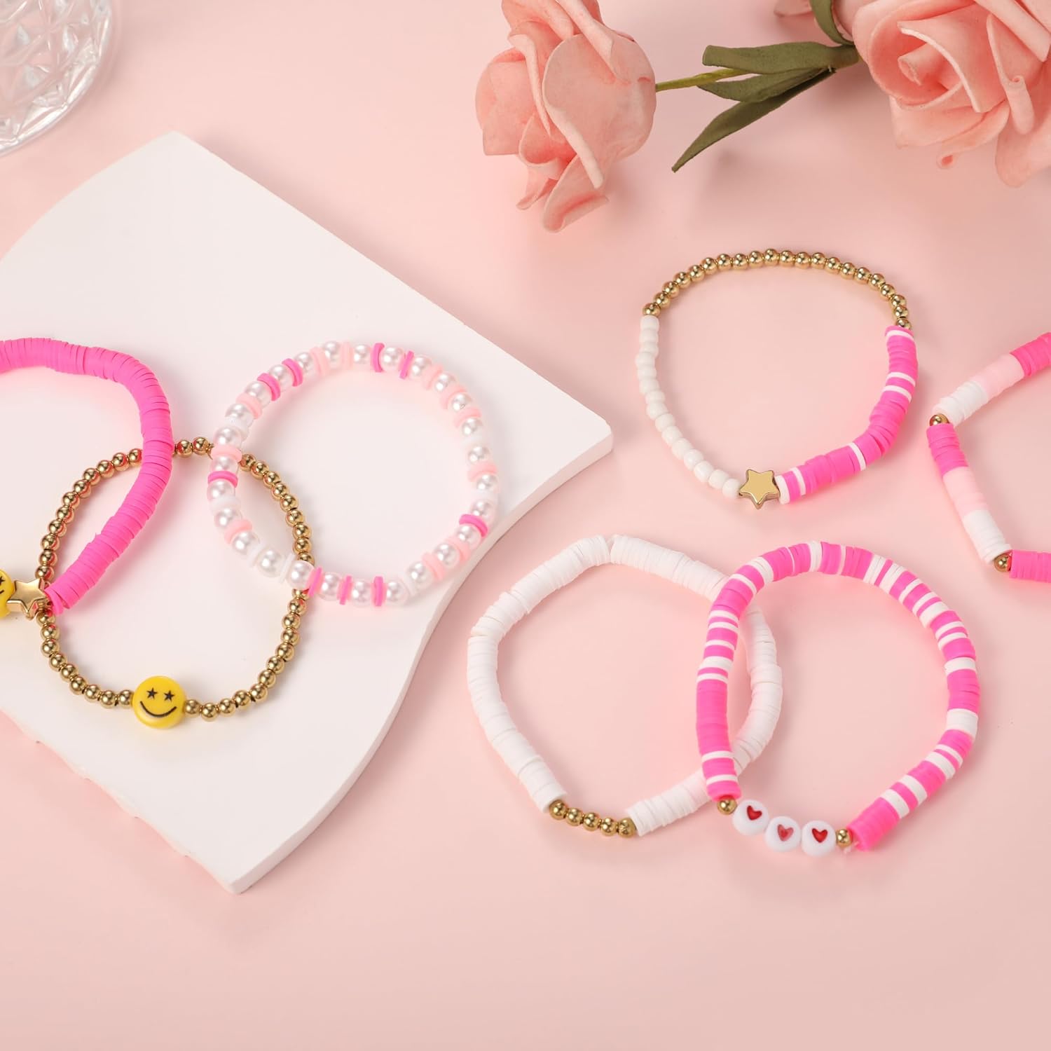 - Design Features: The bracelet set consists of 7 pink bracelets with different styles. It incorporates various special elements, including smiley faces, stars, hearts, golden beads, and white vinyl clay, etc. Each bracelet has a unique charm, showing a rich and diverse preppy style.