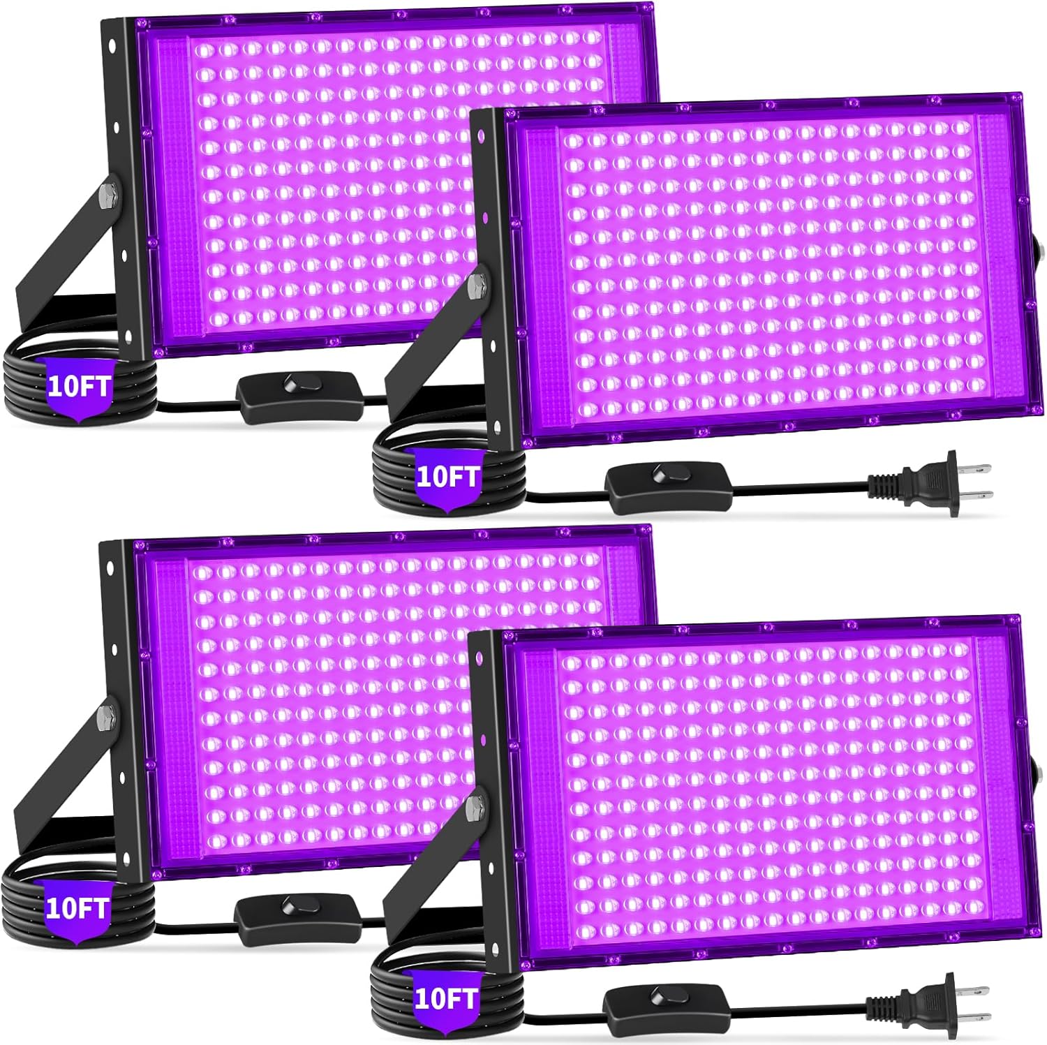 200W Blacklight Flood Light with 10ft Cord+Switch, IP66 Waterproof Outdoor LED Black Lights for Large Space, Glow Party, Halloween, Stage, Gym, Poster, Body Paint, 4 Pack