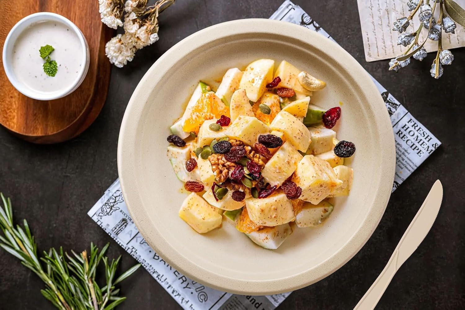 - 【Natural Material】-The compostable plates are made from 100% sugar cane fibres and the cutlery are made from cornstarch, which is plant-based, able to be dissolved by the environment