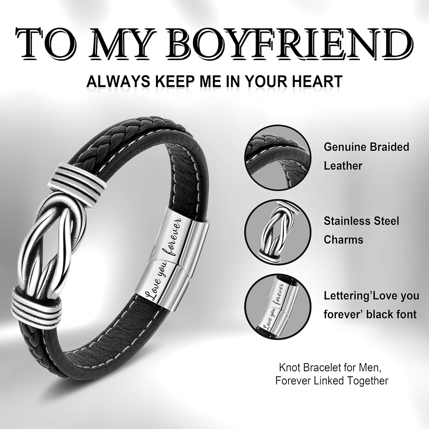 - ๐ใUnique Gifts Mens BraceletใThe knot bracelet for boyfriend comes with a meaningful wish card and a wonderful box. Gifts in the box will add some mystery and surprise and anticipation when you are giving your boyfriend the gift. This contents of the card represent your best intentions and wishes and promises. So let him know that you will always be there for him and love him forever.