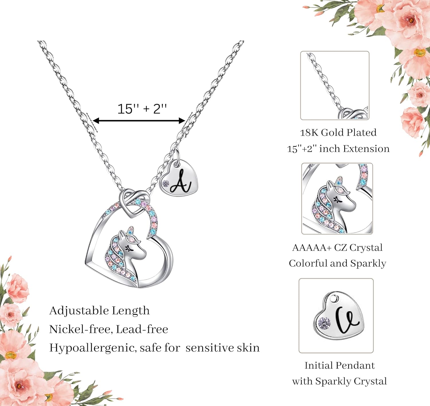 • Unicorn Necklace for Girls: Our unicorn necklace for girls is a dream gift for little princesses. The eye-catching design includes a unicorn, initial and heart pendant along with beautiful and colorful cubic zirconia crystals, making it a perfect piece for any young girl's jewelry collection.