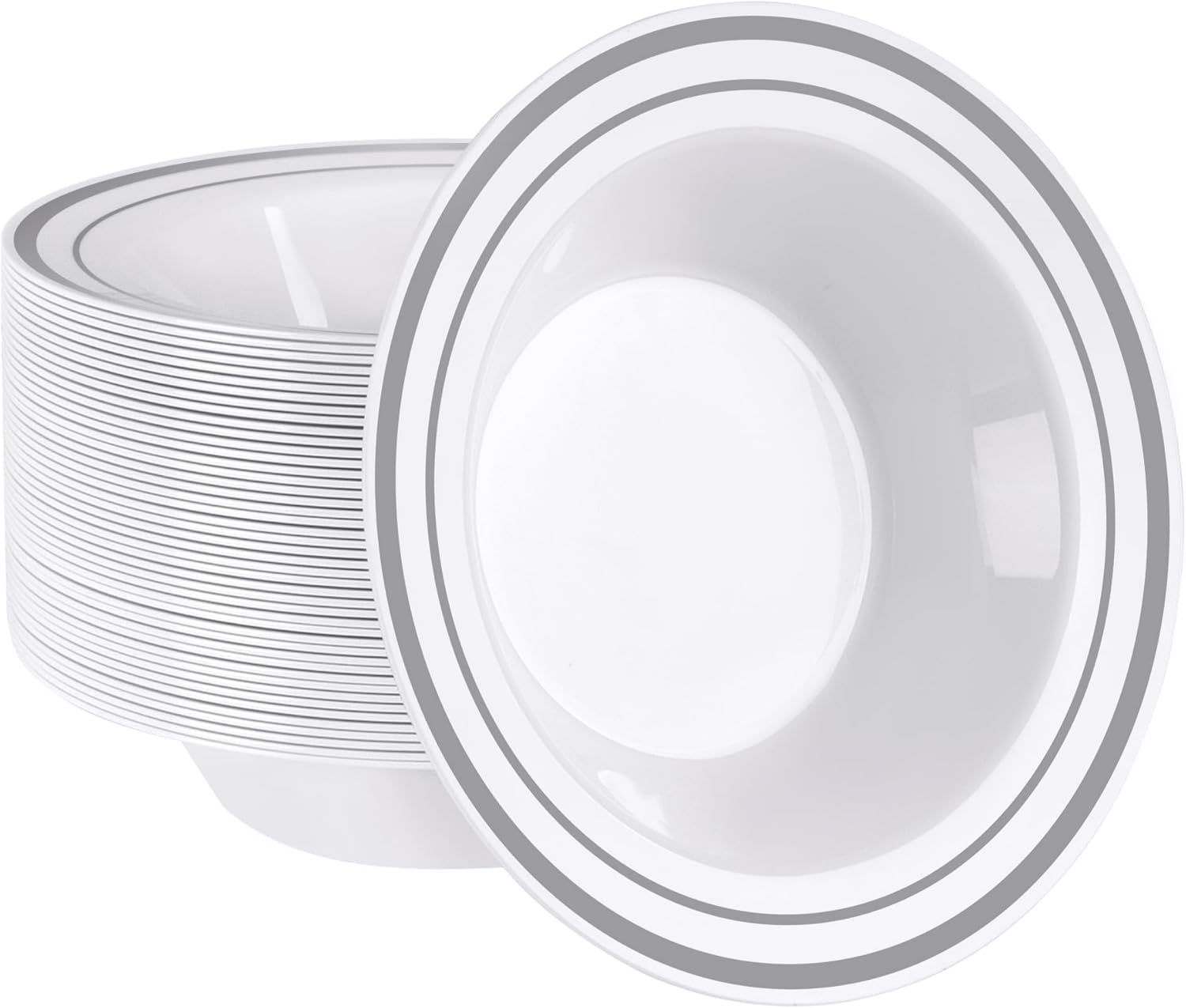 SETUP [12 oz. - 50 Piece Dessert Soup Bowls with Silver Rim, Plastic Bowls Disposable - Premium Heavy-Duty Disposable Soup Bowls for Party, Wedding, and All Occasions
