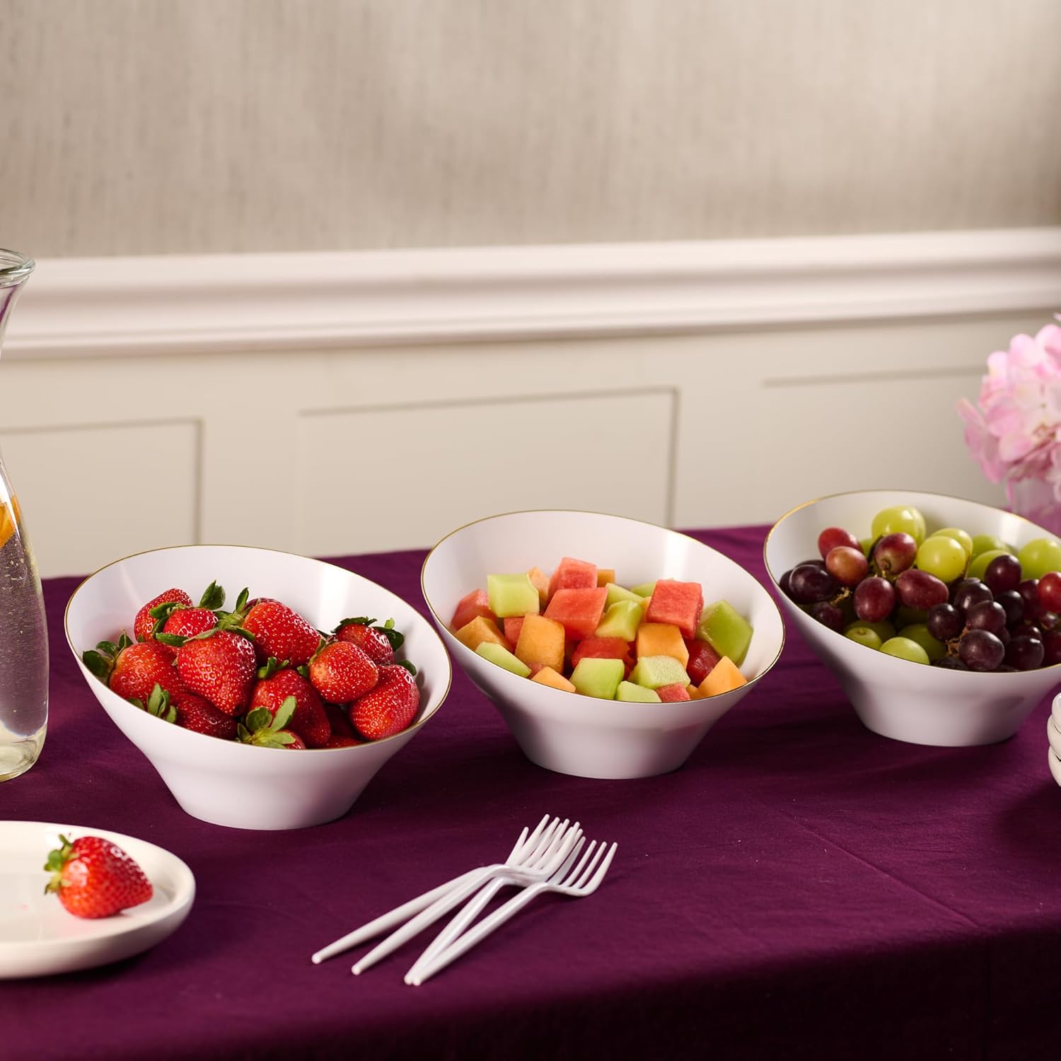 - Elegant gold rimmed white plastic bowls enhance your table and add a sleek touch to your party décor.