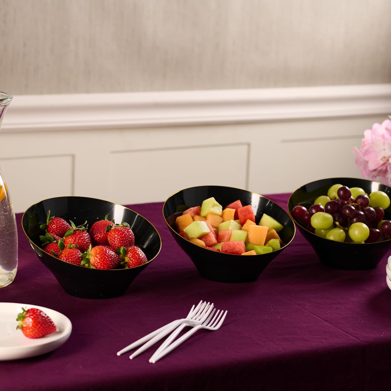 - Elegant gold rimmed black plastic bowls enhance your table and add a sleek touch to your party décor.