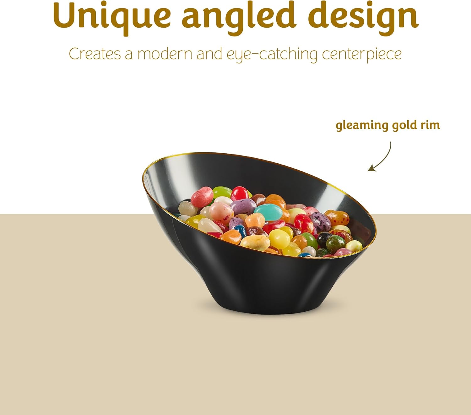 - Elegant gold rimmed black plastic bowls enhance your table and add a sleek touch to your party décor.