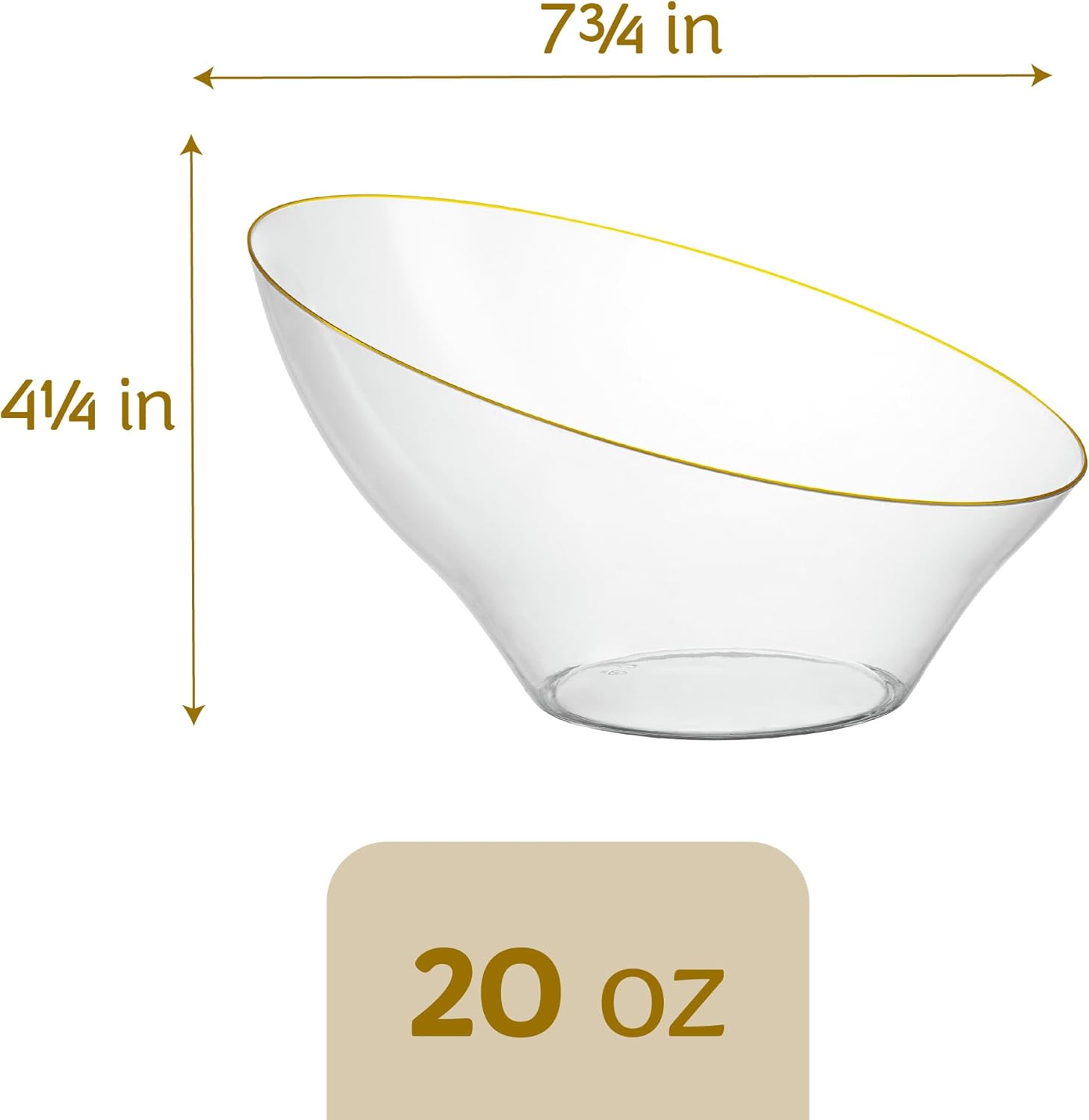 PLASTICPRO Angled Plastic Bowls Disposable Medium Plastic Clear Serving Bowls with Gold Rim for Party for Appetizer Salads Pack of 4