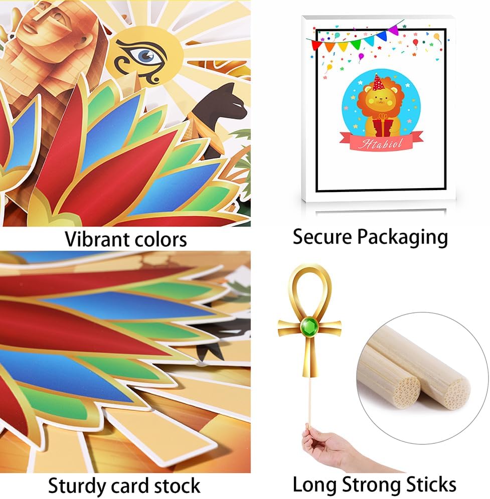 - 2 - High Quality Ancient Egyptian Party Supplies - Made with high quality materials and HD printing, the ancient egyptian props photo booth are sturdy and feature vivid colors. These ancient egypt props have arrived cut out and carefully packaged in a beautiful box with the long sticks and glue dots, foam glue. You can invite your guests or children to assemble these egyptian themed decorations as a enjoyable interaction.