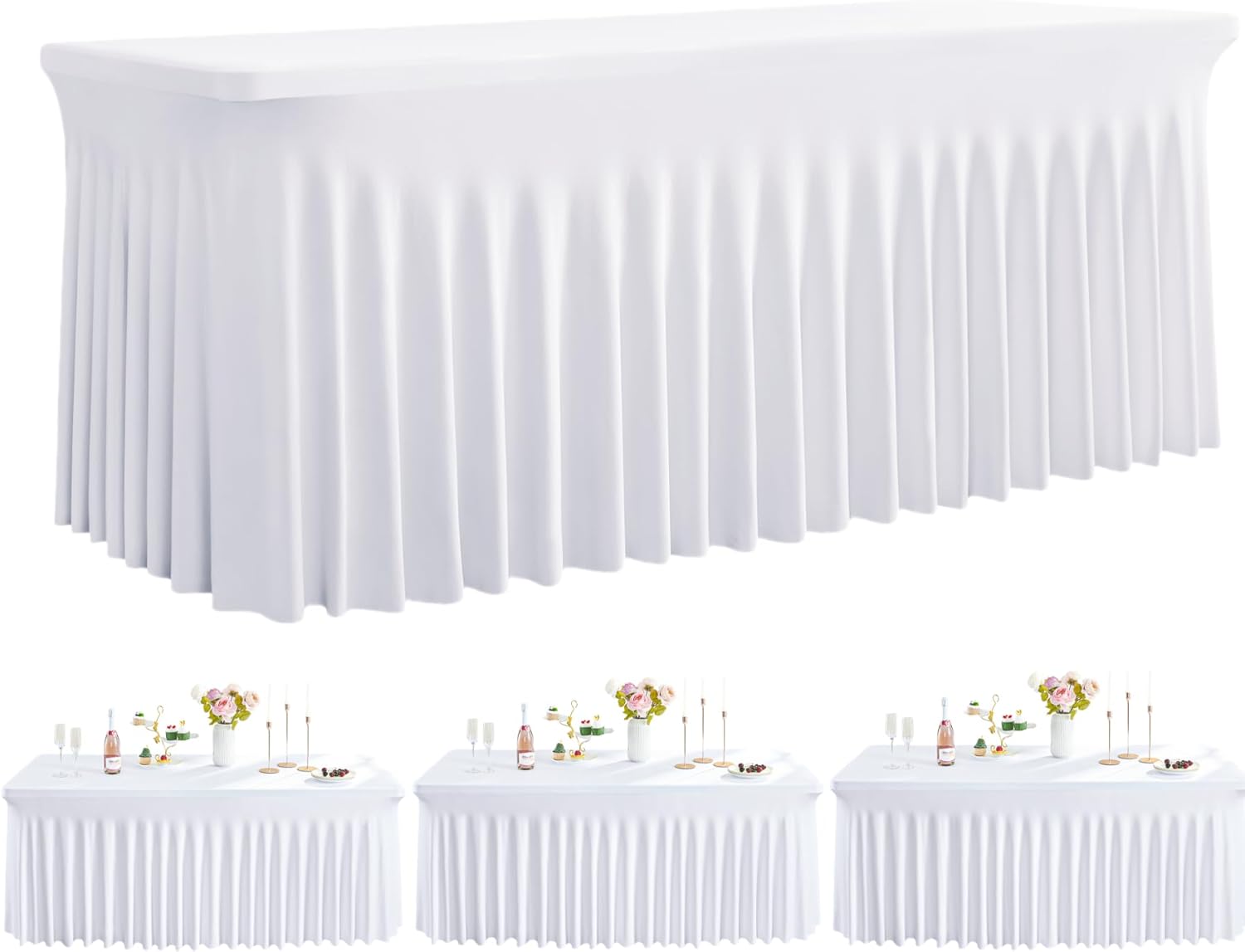 Outpain White Spandex Table Clothes for 8 Foot Rectangle Tables-3Pack 8FT Spandex Fitted Table Cover, Wrinkle Free Tablecloths with Skirt for Parties, Wedding, Birthday, Banquet, Festival