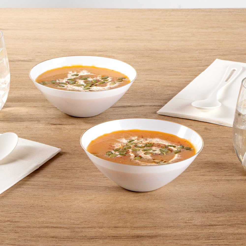- GOLD-RIMMED: Spruced up with a lustrous gold rim, these premium quality plastic bowls enhance the look of the food presentation at your banquets and catered events. Make a statement!