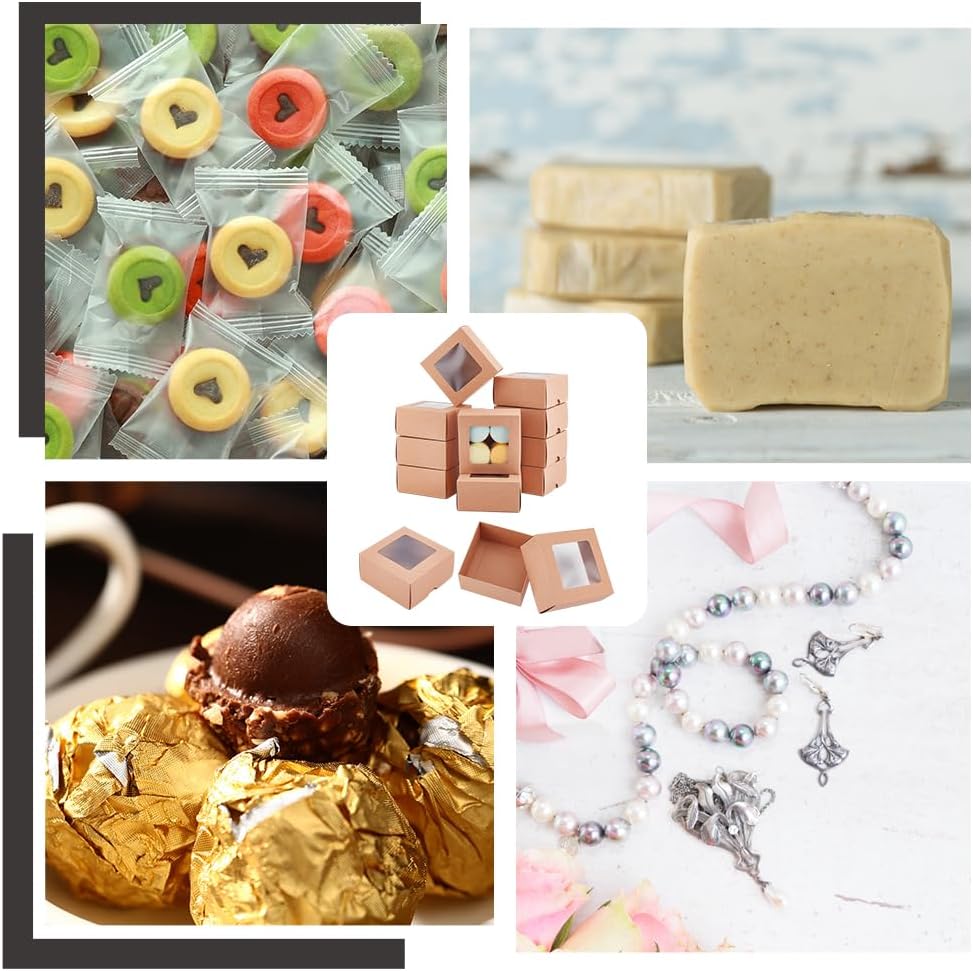 BENECREAT 12PCS Brown Kraft Paper Box with Clear Window, 3.94x3.94x1.97inch Square Kraft Paper Gift Box, Suitable for Wedding Party Gifts, Jewelry Packaging