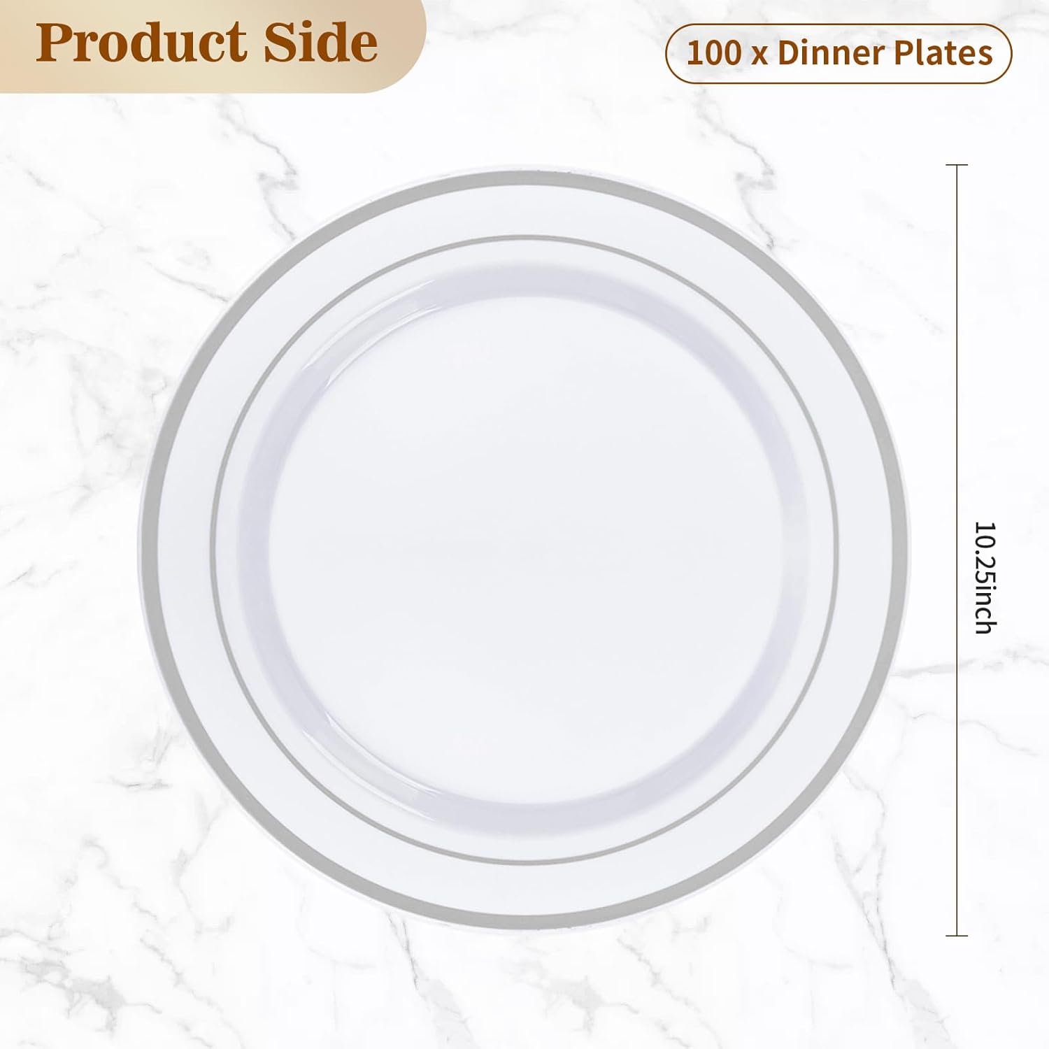 - DIMENSION DECODED - Elevate your dinner delights with our party supplies. Unveil elegance with 100 exquisite dinner plates (10.25''). Thoughtfully chosen for sweet and savory pleasures, these elegant party plates are perfect for presenting delightful cakes and more. Elevate any occasion, showcasing culinary masterpieces with style.