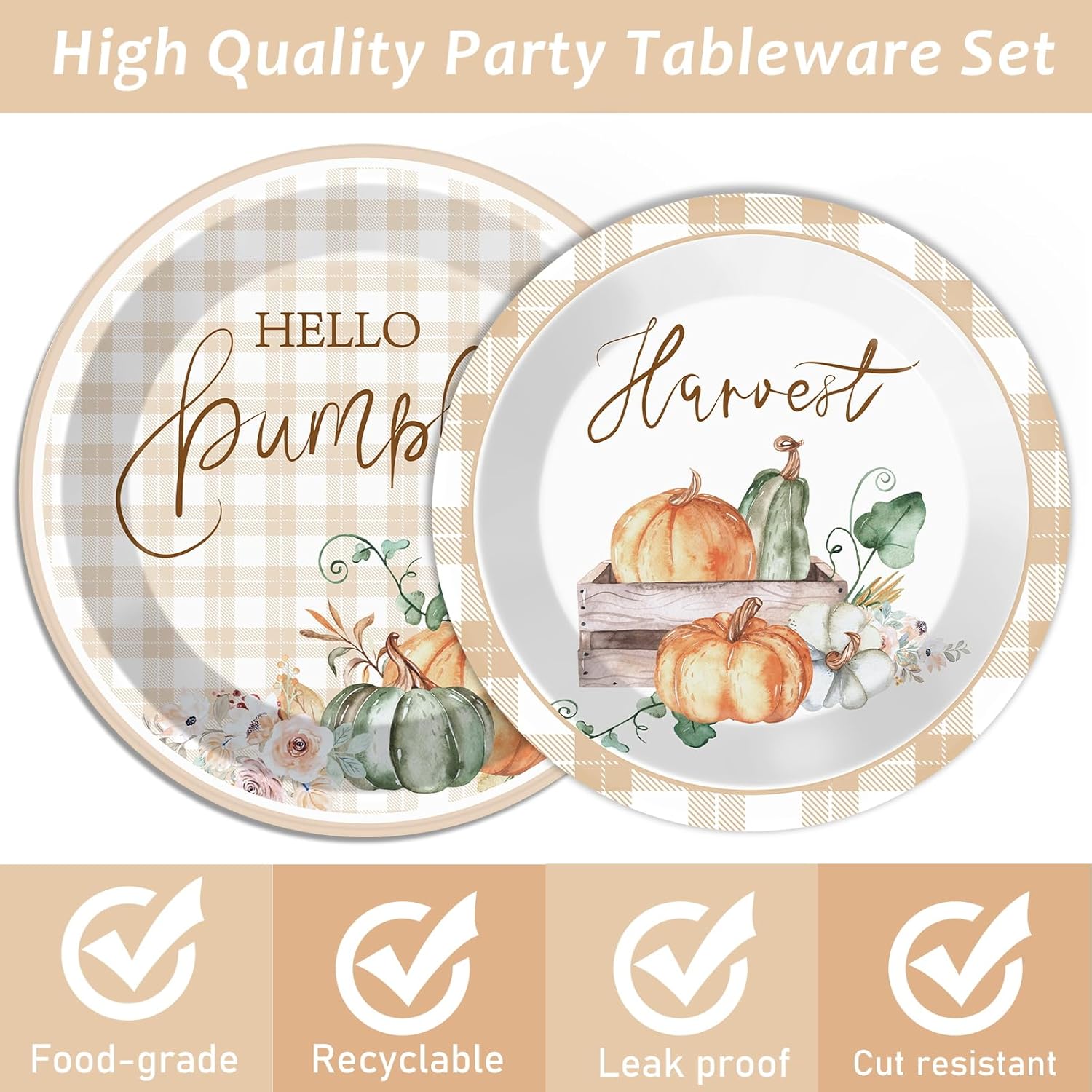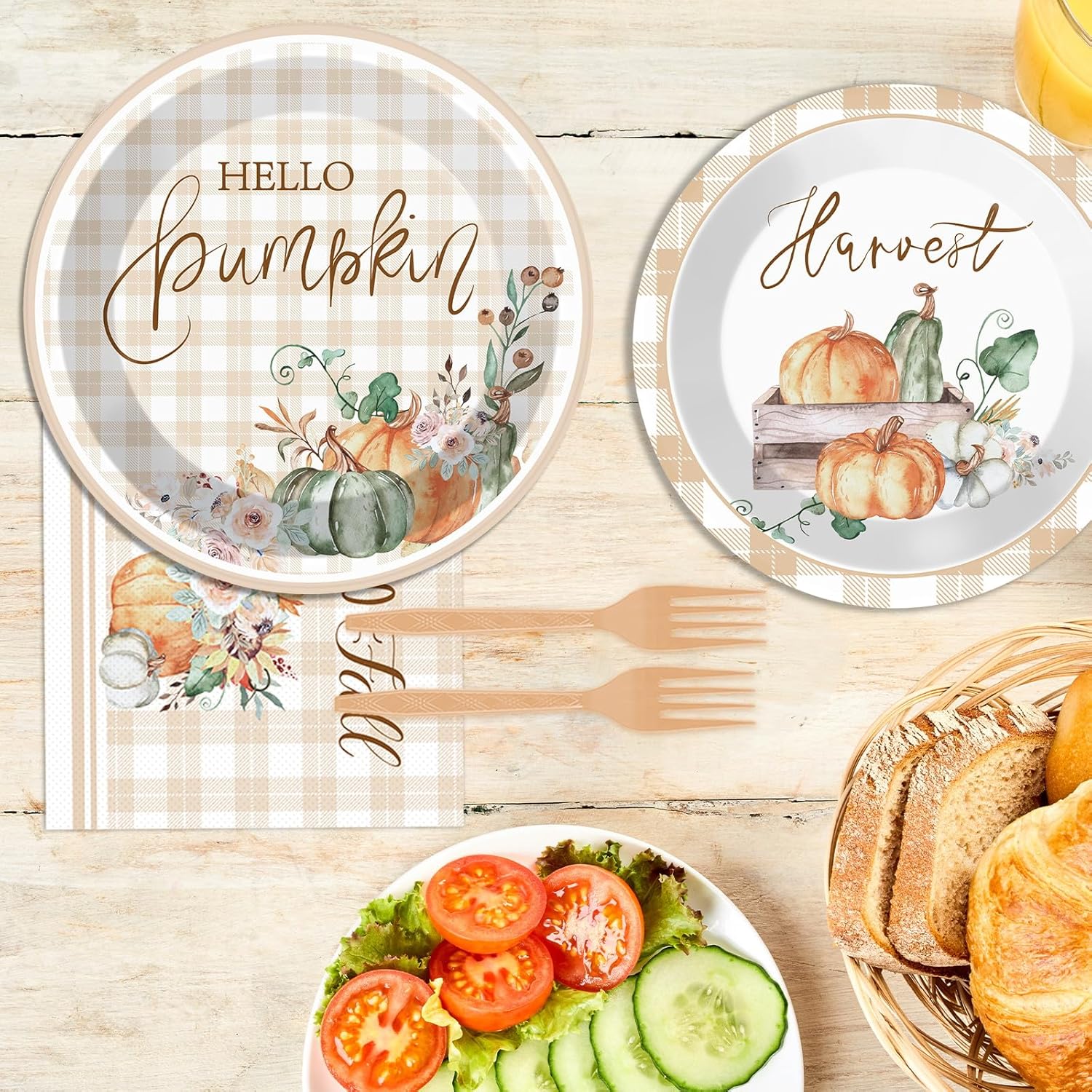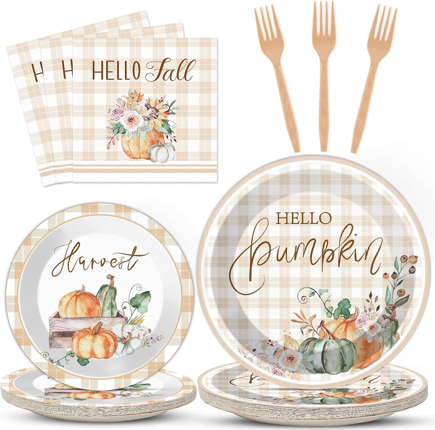 - Unique design: this fall thanksgiving buffalo plaid tableware set design consists of watercolor paintings of pumpkins, flowers and with the words "Hello Thankful", "Harvest" and "Hello Fall", these beautiful patterns create the atmosphere of autumn and bring the joy of harvest and the feeling of gratitude. These beautiful designs create the atmosphere of fall and bring the joy of harvest and the feeling of thanksgiving.