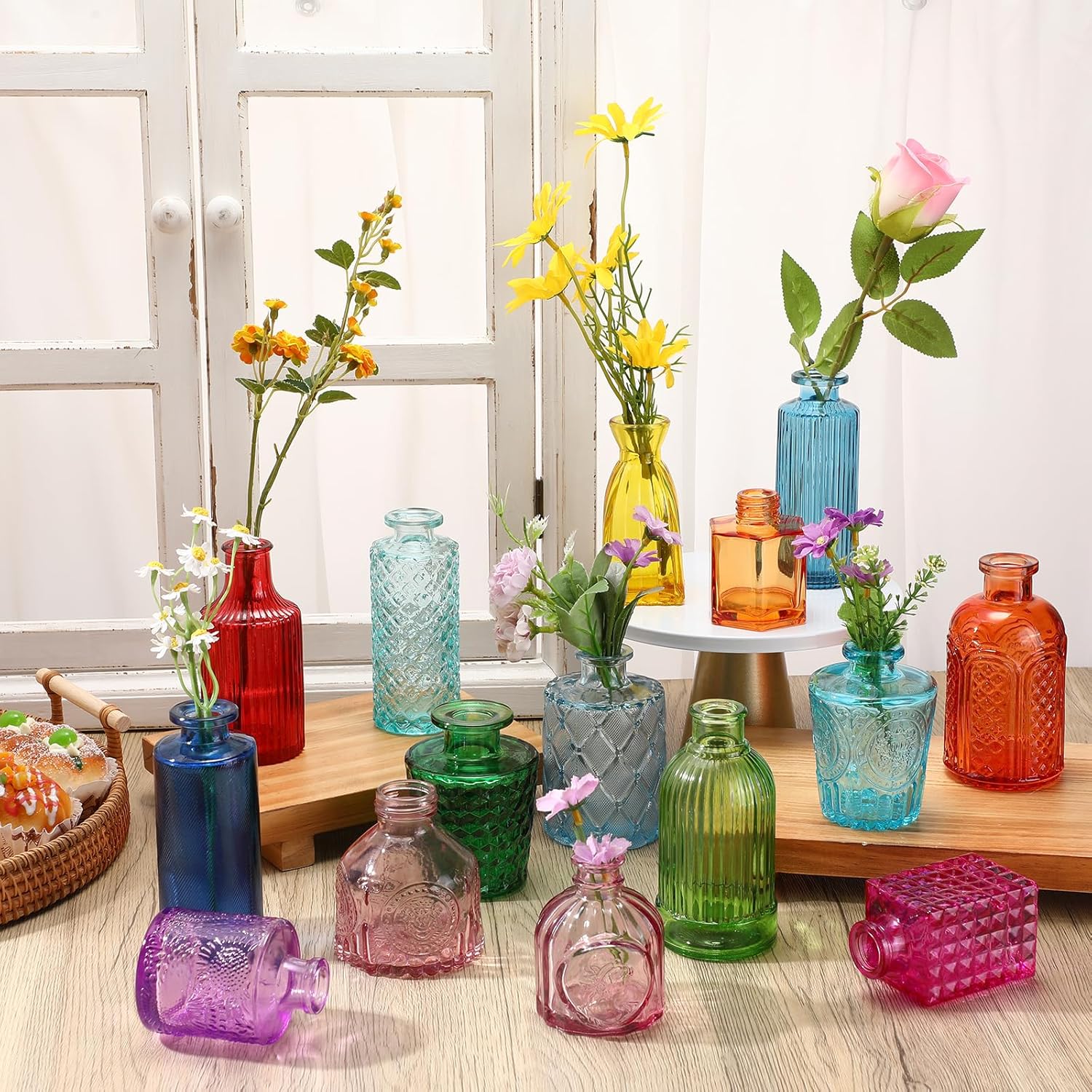 Yaomiao 30 Pcs Vases Bulk Colored Flower Glass Christmas Vases Bud Vintage Colored Glass Bottles Colorful Rustic Embossed for Home Wedding Table Decorations Gifts(Bright Color)