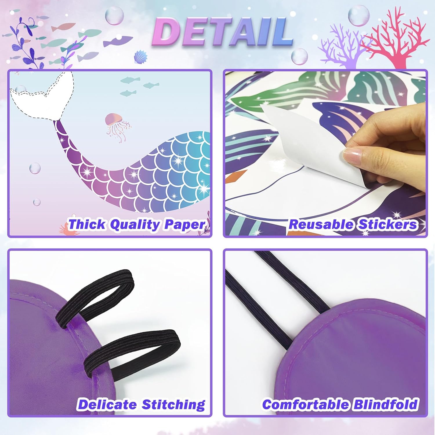 - 【Products Include】You will receive a 21" x 28" mermaid game poster, two fabric soft eye mask, 24PCS mermaid Tail stickers and 20 PCS glue dots.