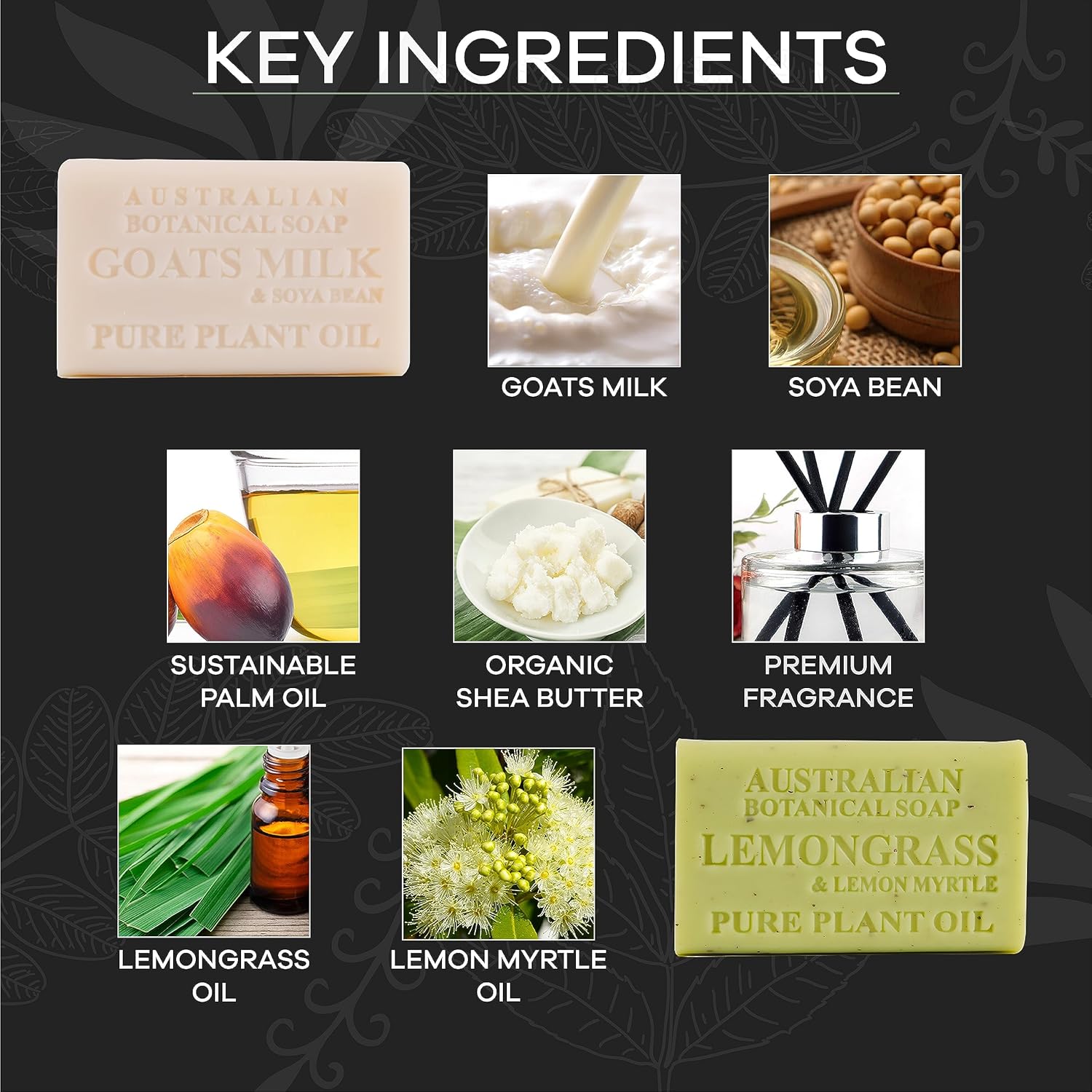 - Mens Bar Soap Bundle: Gently cleanse your skin without drying it out with our natural base soap bars. Crafted in Australia with high-quality ingredients to keep your skin feeling moisturized and hydrated and feeling smooth and refreshed. Includes 4 classic Goats Milk and 4 clean and invigorating Lemongrass 6.6 oz. mens soap bars.