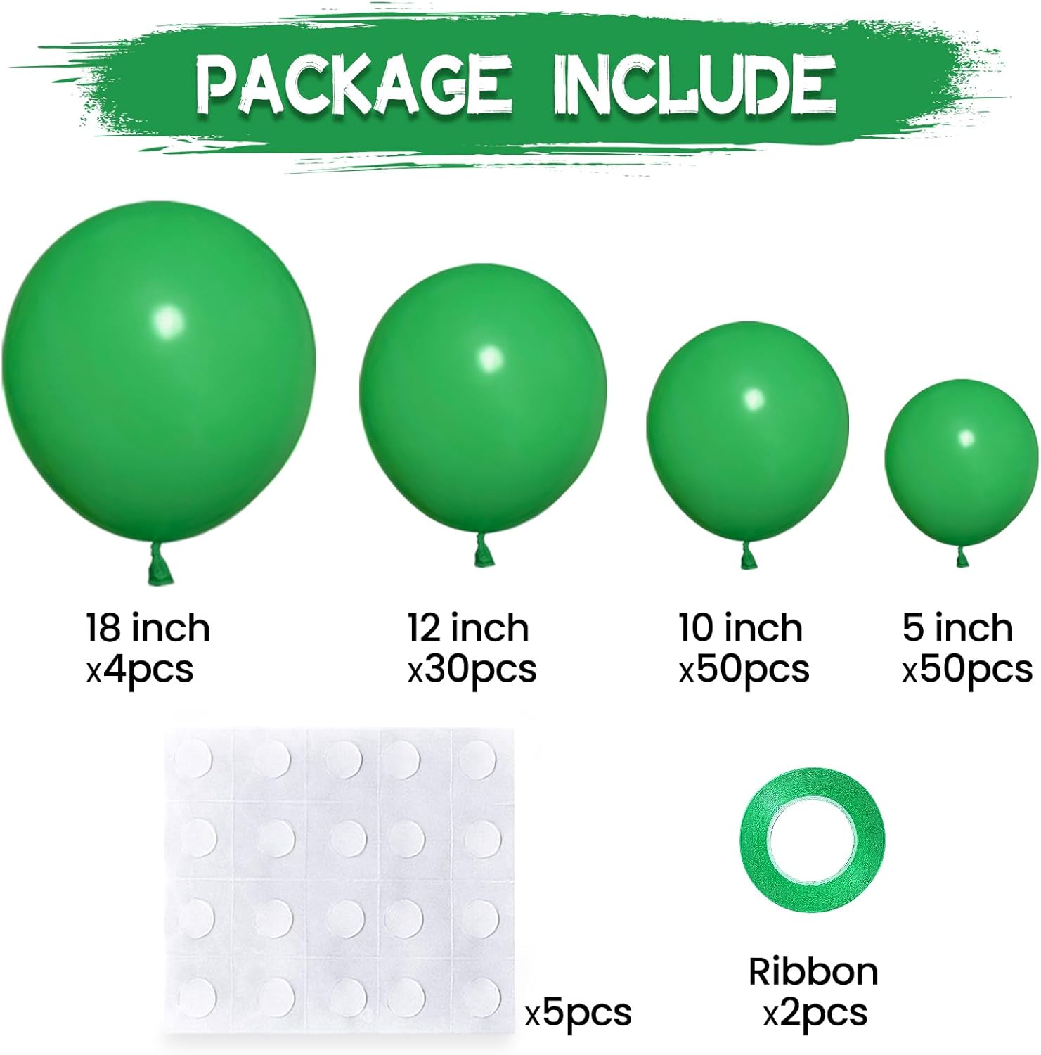 - Green party balloons kit contains 134pcs green Balloons Different Sizes, They are 4pcs 18 in balloon, 30pcs 12 in balloon, 50 pcs 10 in balloon, 50 pcs 5 in balloon. Perfect size and quantity of green balloons garland kit to create best atmosphere in your party!