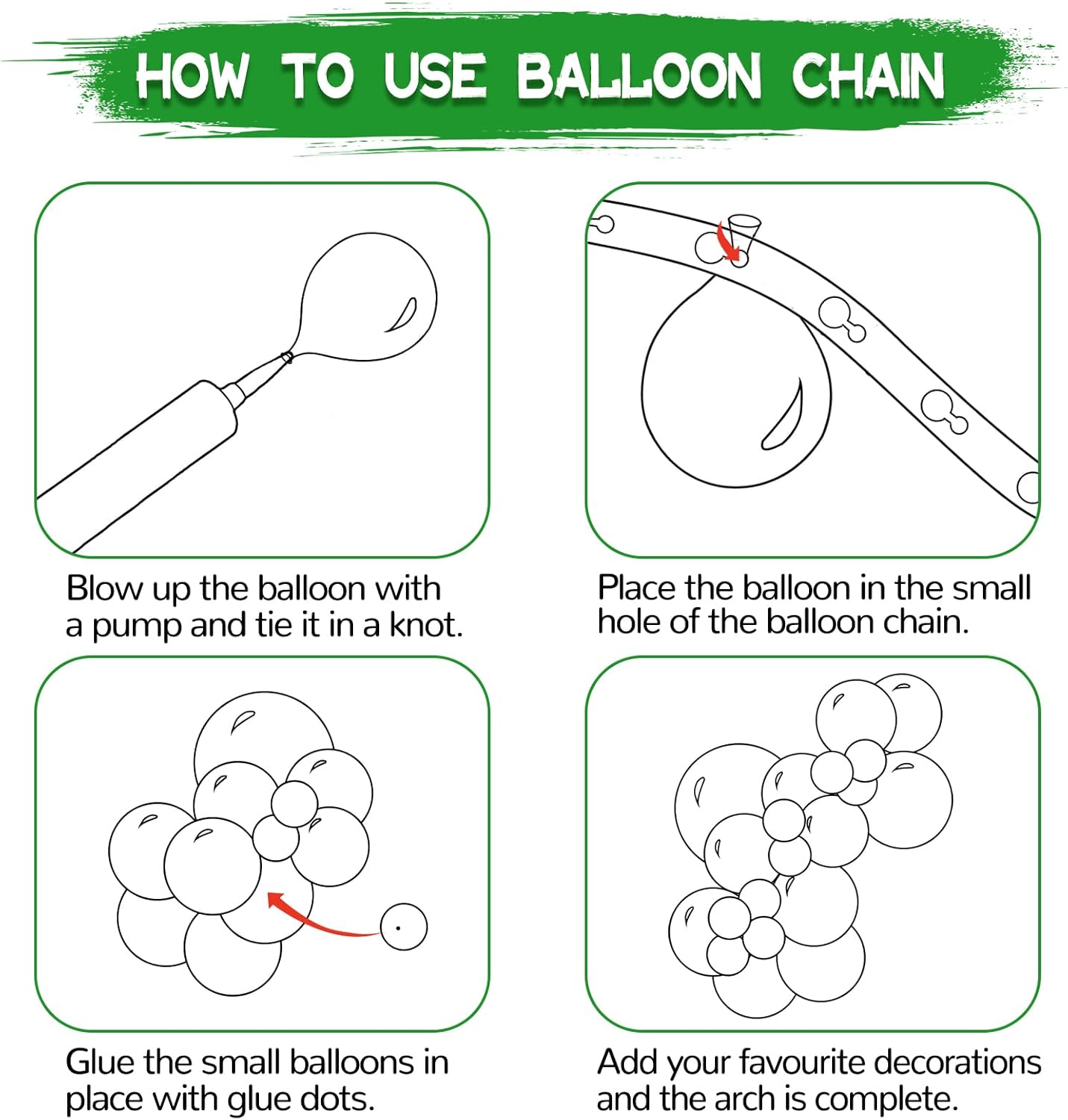 - Easy to Assemble green Balloon Arch, we offer ribbon glue dots and balloon chains for these mixed sizes green balloon set, making the balloon kit easy to use, using them will save time and effort, which can help you make party decorations easier. You can fully use your imagination to make balloon decorations of different shapes. You can even make a perfect green balloon garland arch from balloons of various sizes, Just let them make your party even more unique, and it will be unforgettable.