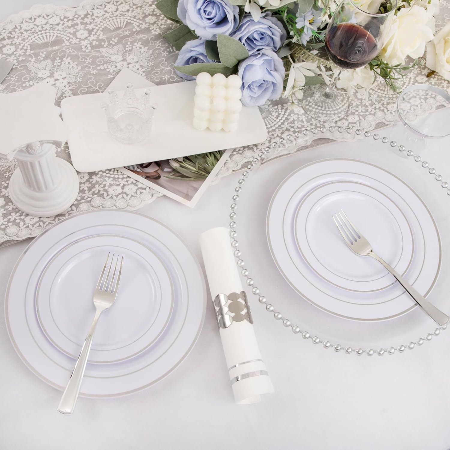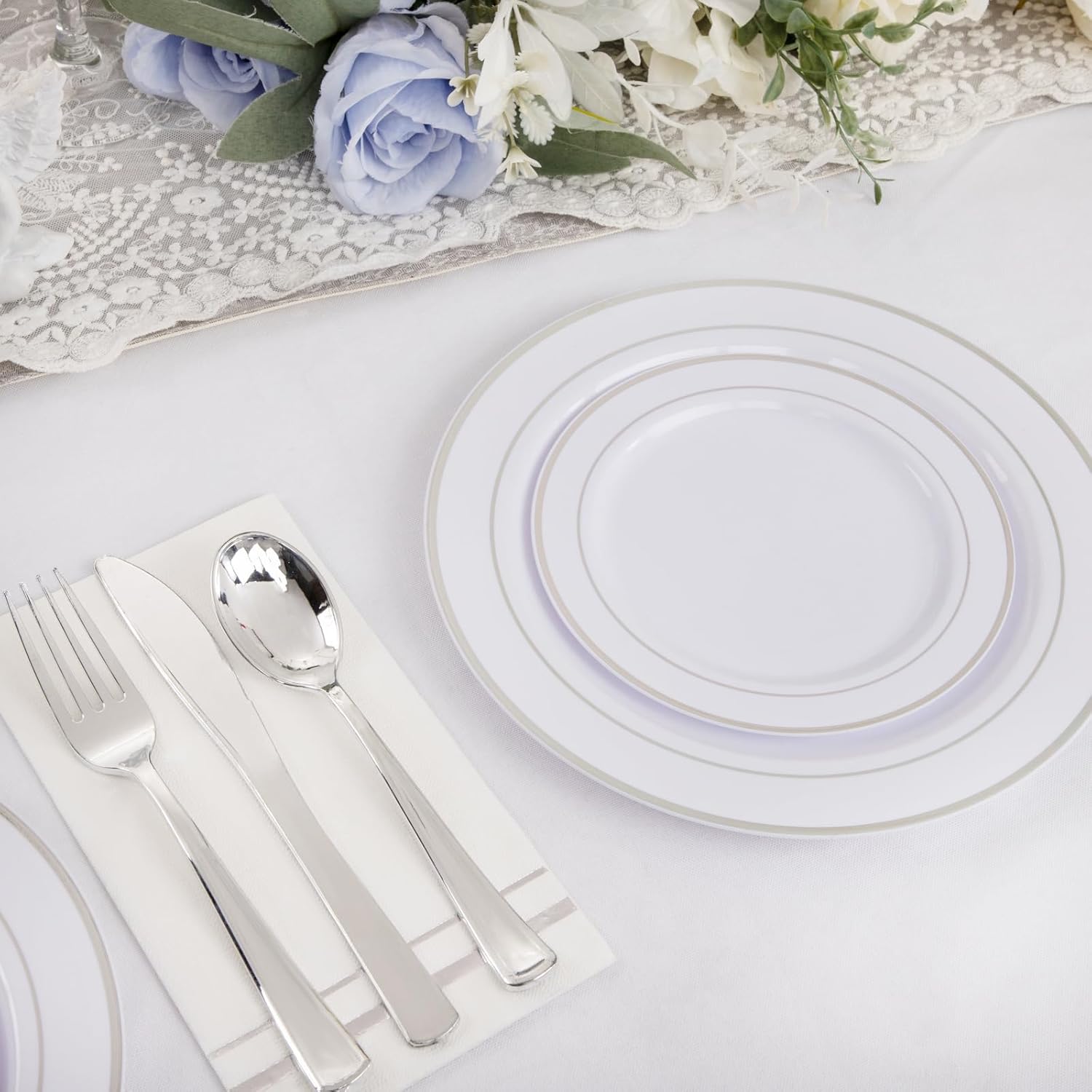 GATHER 350PCS Silver Plastic Plates - White and Silver Disposable Plates for 50 Guests Includes 50 Dinner Plates 50 Dessert Plate 50 Napkins 150 Silvery Cutlery and 50 Cups for Wedding & Party