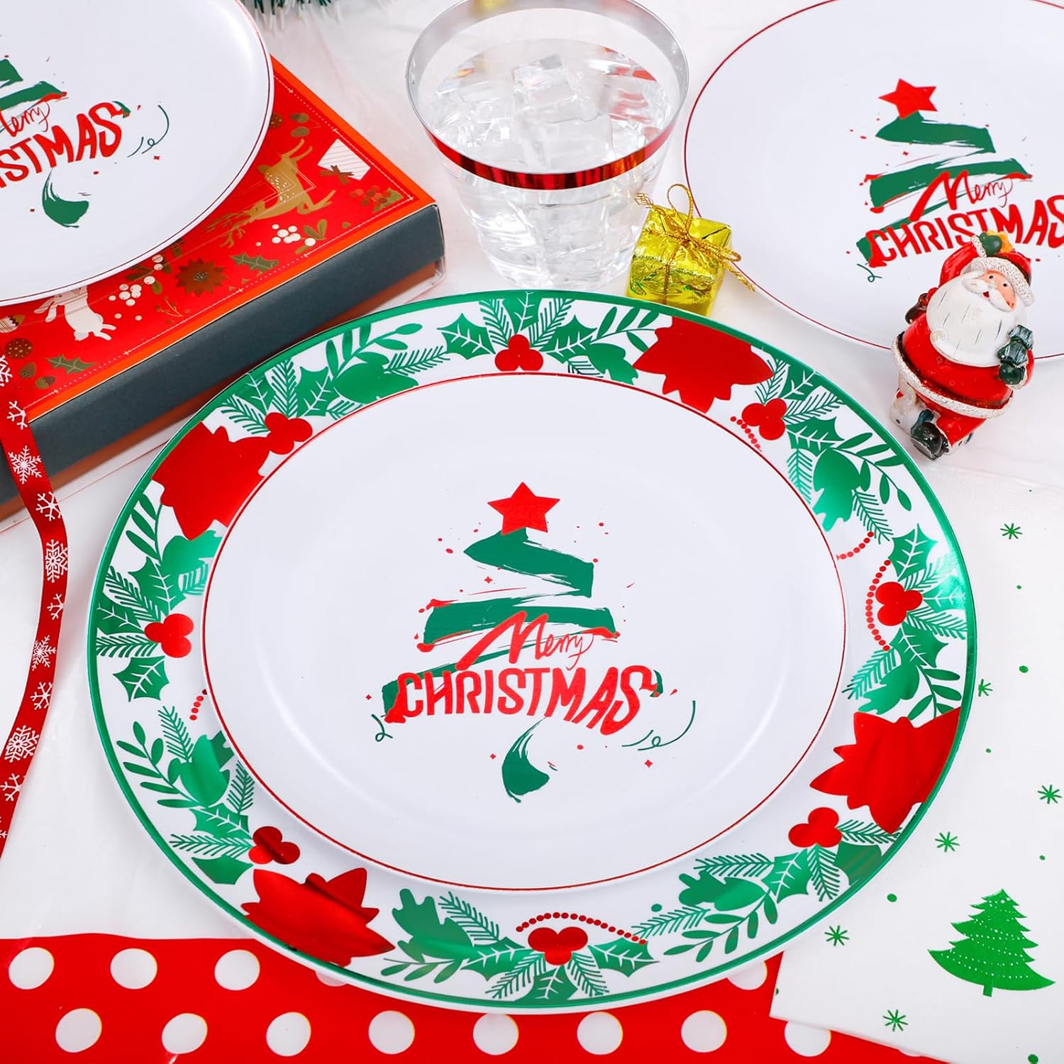 - Great Value: GATHER Christmas plates contains 50 plastic plates, 75 red plastic silverware, 25 Christmas paper napkins, and 25 red rim plastic cups, 1 plastic tablecloth. The tablecloth unfolds size 108*54 inches, the Christmas dinnerware sets can satisfy the 25 guests at one time