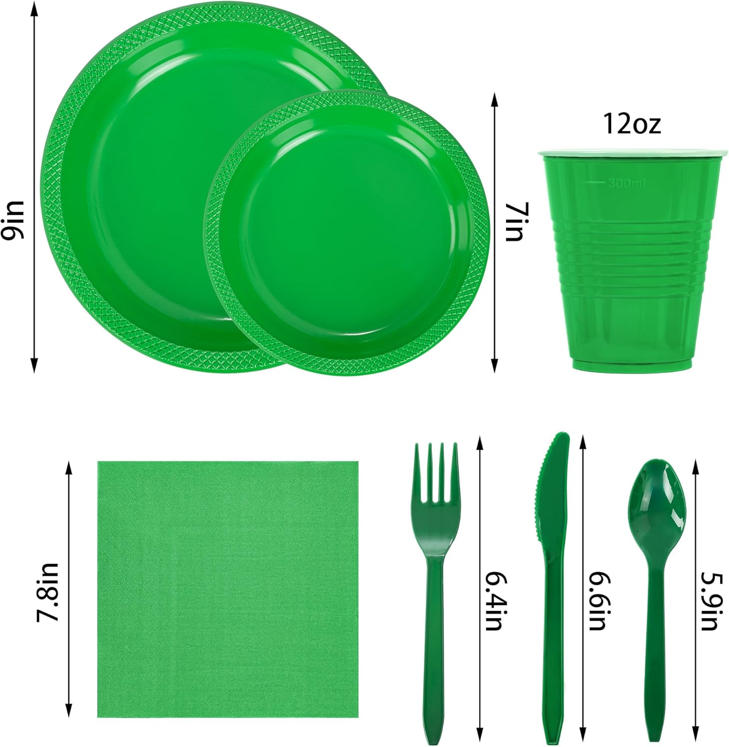 - WHAT YOU GET:These green plates disposable for party are very suitable for gatherings and can meet all the party needs of 30 guests. The set includes 30pcs 9inch dinner plates, 30pcs 7inch dessert plates, and 30 green cups,30pcs spoons, 30 forks, 30 knives. If you invest in this set of party plates, it will be your perfect choice.