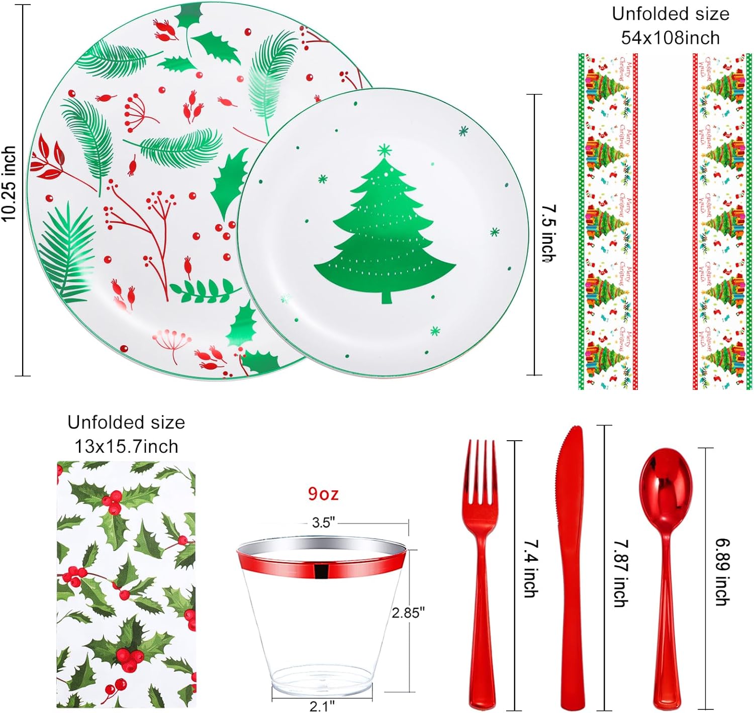 - 【CHRISTMAS EXCLUSIVE DESIGN】:Unique green and red plastic plates with green "Christmas tree" pattern, consisting of 25 dinner plates, 25 dessert plates, 25 sets of Christmas plastic silverware, 25 plastic cups, 25 holly berry napkins 13*15.7 inches (unfolded size), 1 plastic Christmas tree tablecloth 54*108 inches (unfolded size). These sparkling holly berry plates and printed holly berry napkins are full of Christmas cheer and add elegant decorations to your party.