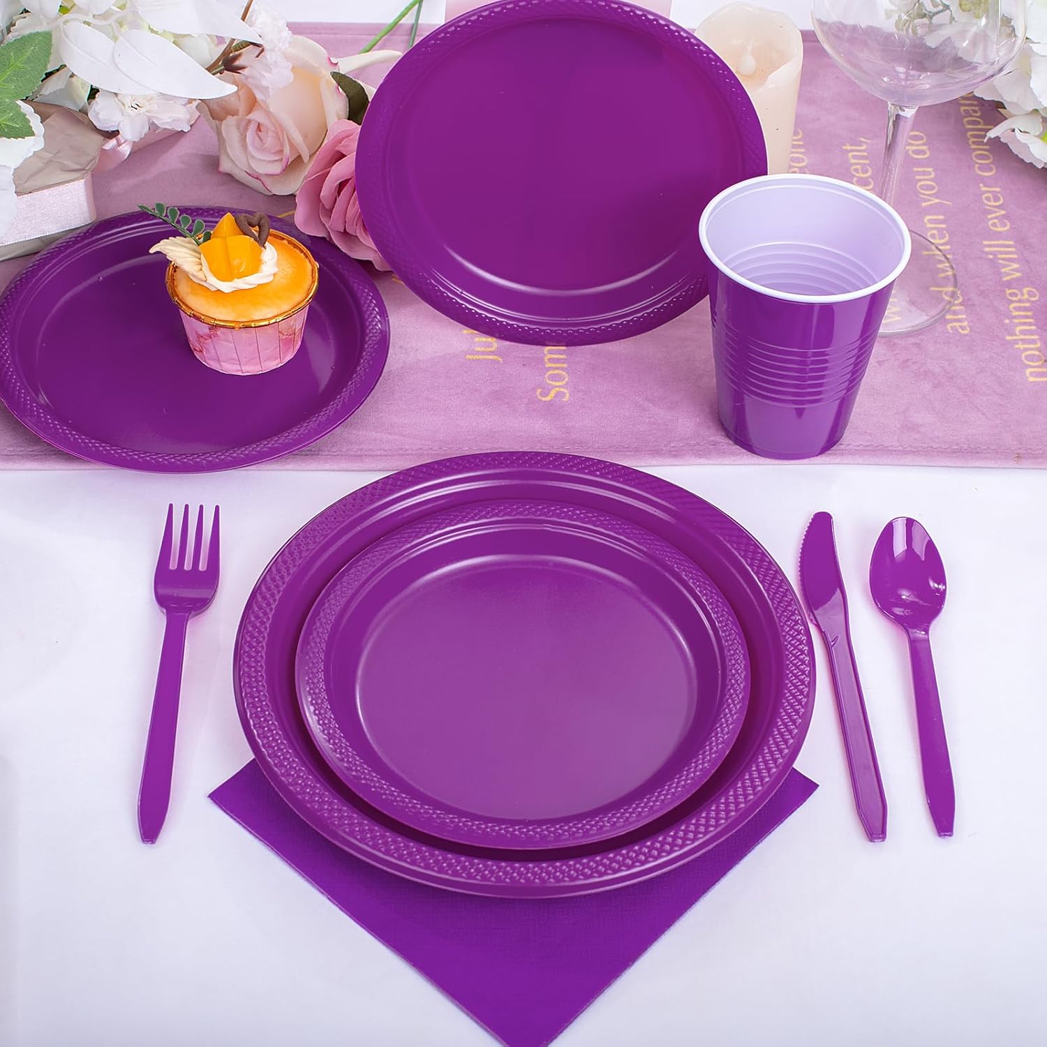 WELLIFE 210Pcs Purple Plastic Dinnerware Set, Party Supplies Including Party Plates and Cups and Napkins Sets for 30 Guests, Purple Plastic Plates