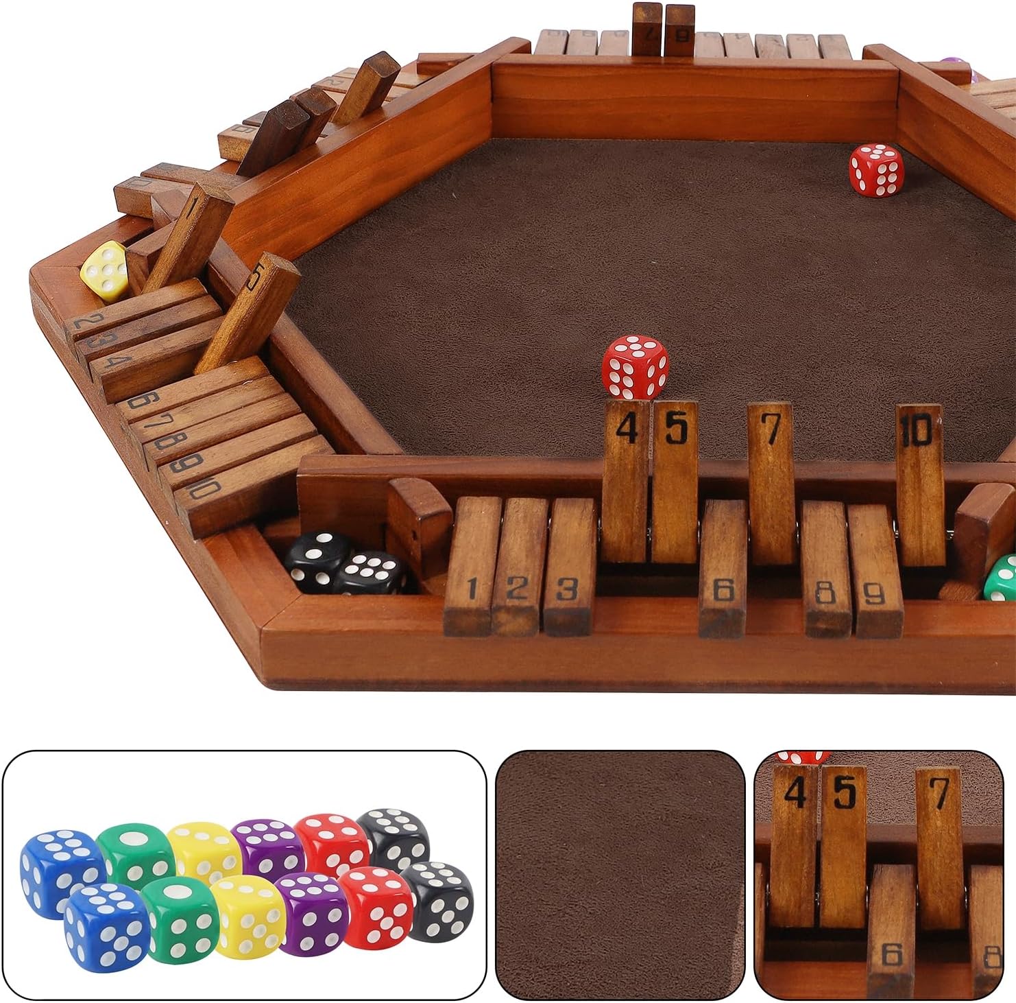 - Funny Board Game: This family-friendly shut the box board game can provide hours of entertainment for up to six players at once due to its shape. each side of the six-sided hexagon box contains a row of wooden tiles numbered from 1-10, and each with two dice included. Attention- Not suitable for children under the age of 3 years. Small parts! Choking hazard