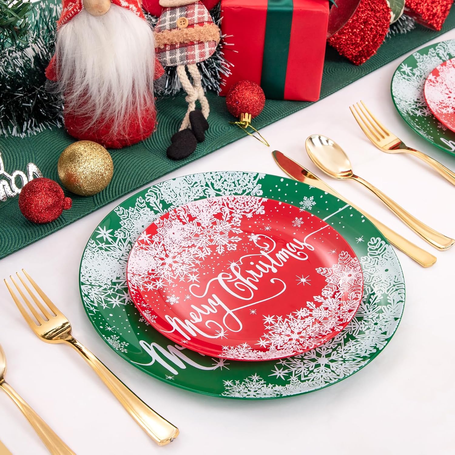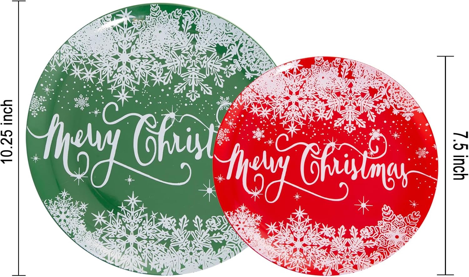 - Christmas Design: Our christmas green plastic plates set features a stunning combination of green dinner plates and red appetizer plates, adorned with delicate snowflake patterns and festive greetings. Perfect for adding a touch of holiday cheer to your winter celebrations.
