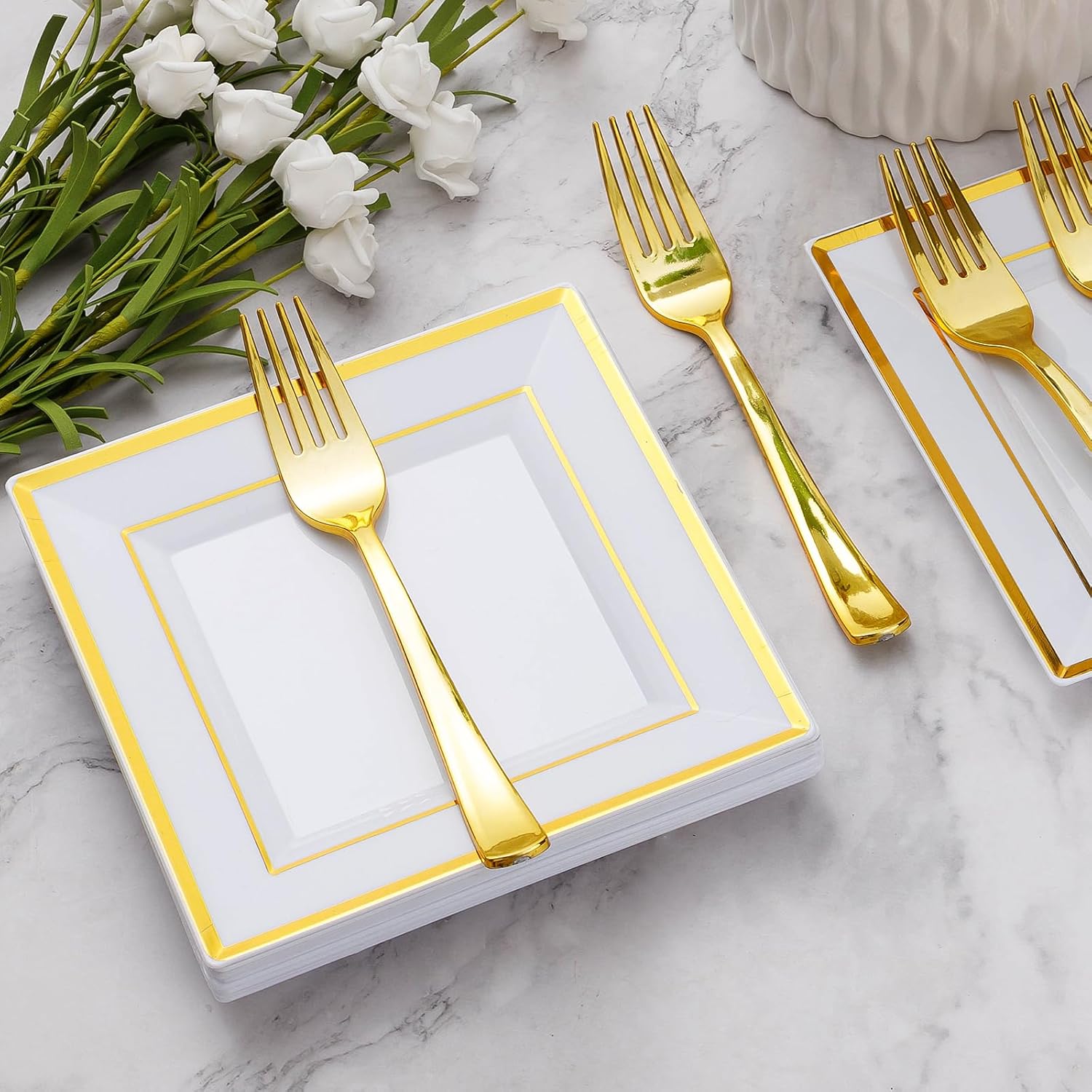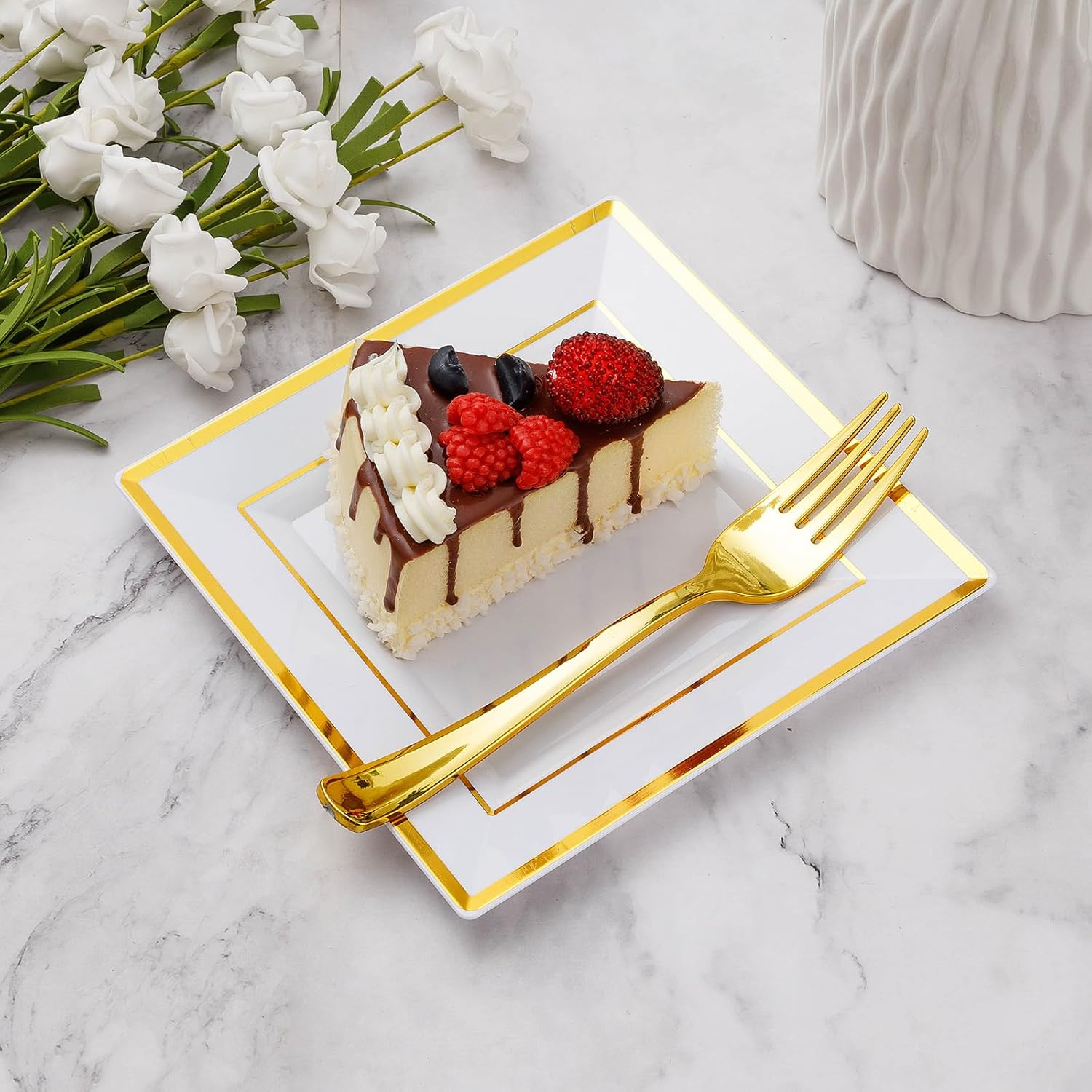 - WHAT'S YOU GET - A convenient 120PCS that includes 60 x 6.5" gold square dessert plates and 60 x 7.4" plastic forks. Our disposable plates ensure a hassle-free post-party experience, freeing you to savor moments with family and friends instead of worrying about cleanup.