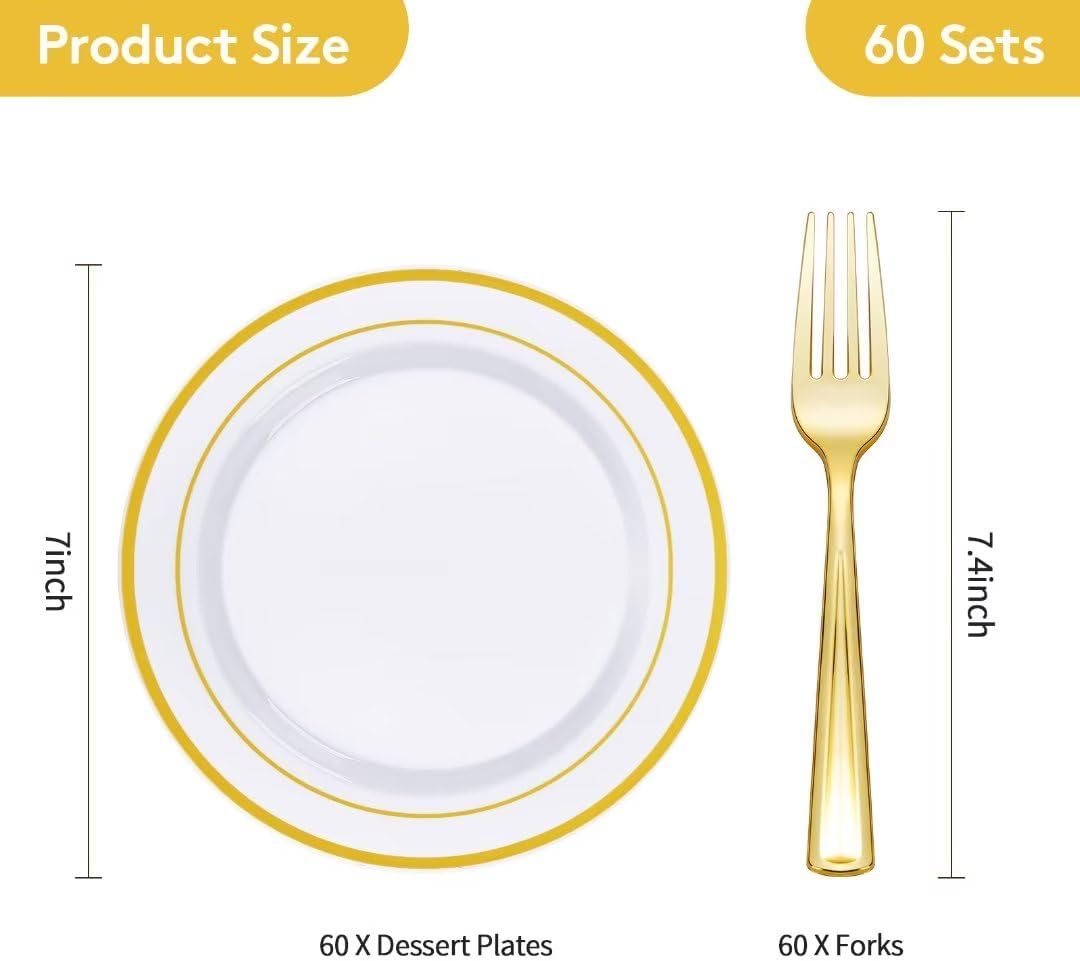 - WHAT'S YOU GET - A convenient 120PCS that includes 60 x 7" round dessert plates and 60 x 7.4" plastic forks. Our disposable plates ensure a hassle-free post-party experience, freeing you to savor moments with family and friends instead of worrying about cleanup.