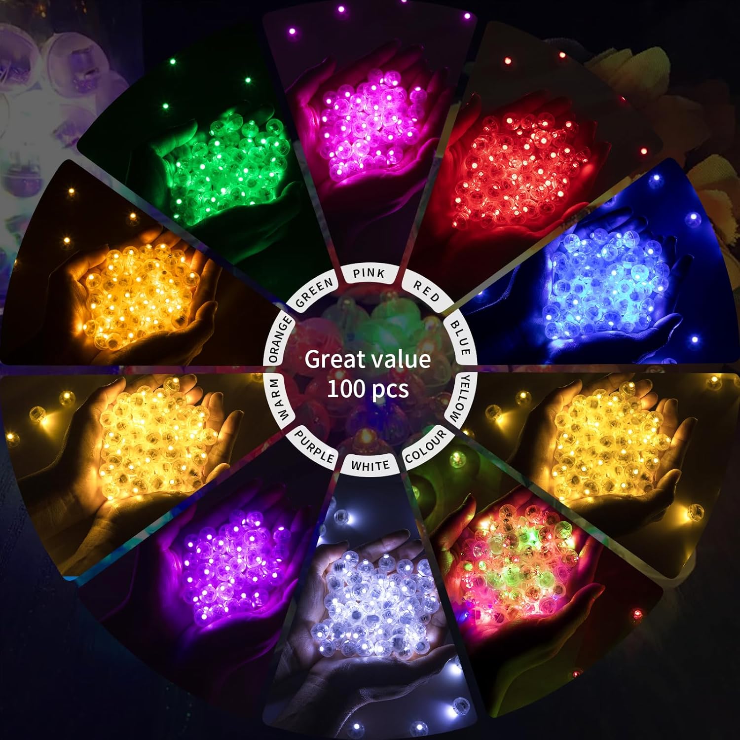 - 【Colorful Mini Lights】The package contains 100pcs in 10 Colors, 10pcs each of white, rainbow colors(flash to change color), red,orange, blue, green, yellow, warm white, purple, and pink. Mini size (0.5 inches in diameter), light weight with a transparent case, these mini led lights are easy to hide in various places. Decorate the night party with the LED Balloon Light
