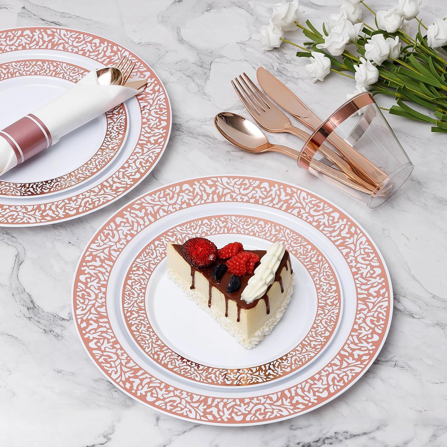 - EXQUISITE DESIGN - The white plates with a rose gold lace rim bring a sophisticated and luxurious touch, elevating the festive atmosphere with a high sense of style. These rose gold party plates can enhance setting and food without feeling out of place, providing guests with a unique dining experience.
