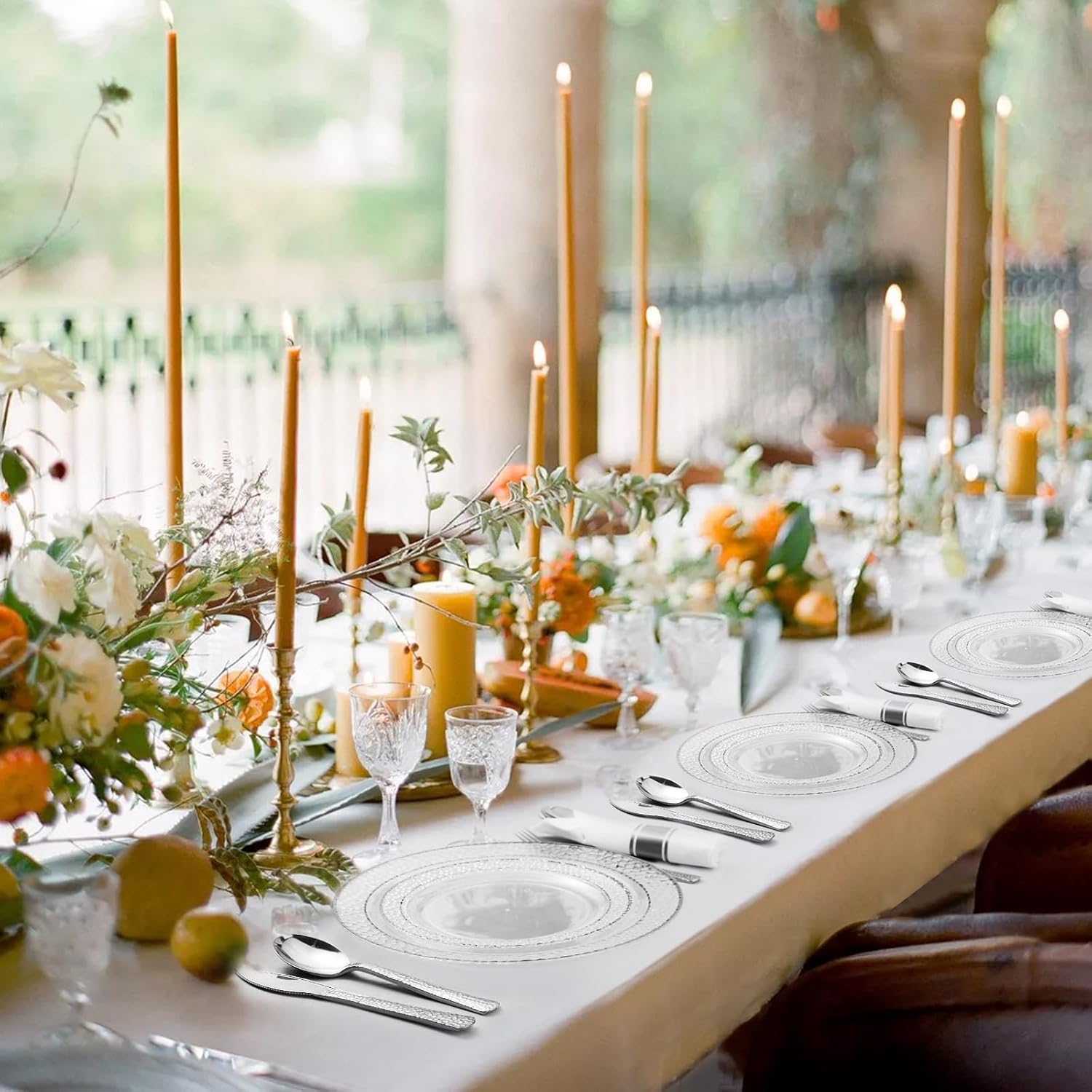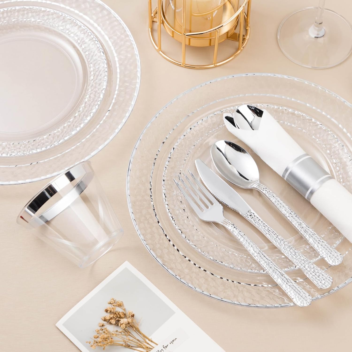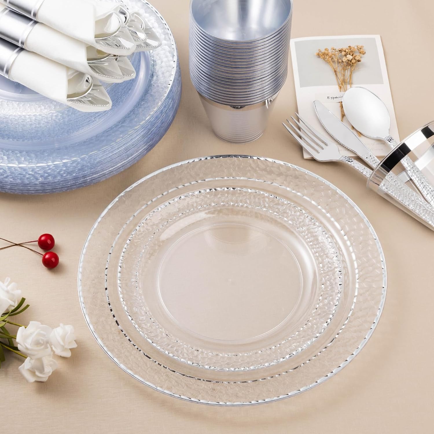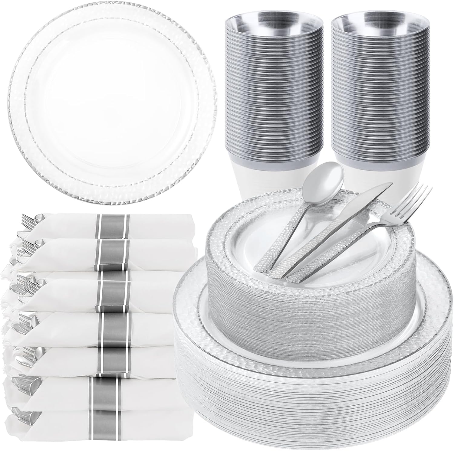 350PCS Clear Plastic Plates with Silver Trim for 50 Guests, Disposable Dinnerware Set for Party & Wedding, Includes 100 Plastic Plates, 50 Pre Rolled Napkins with Silver Silverware, 50 Cups