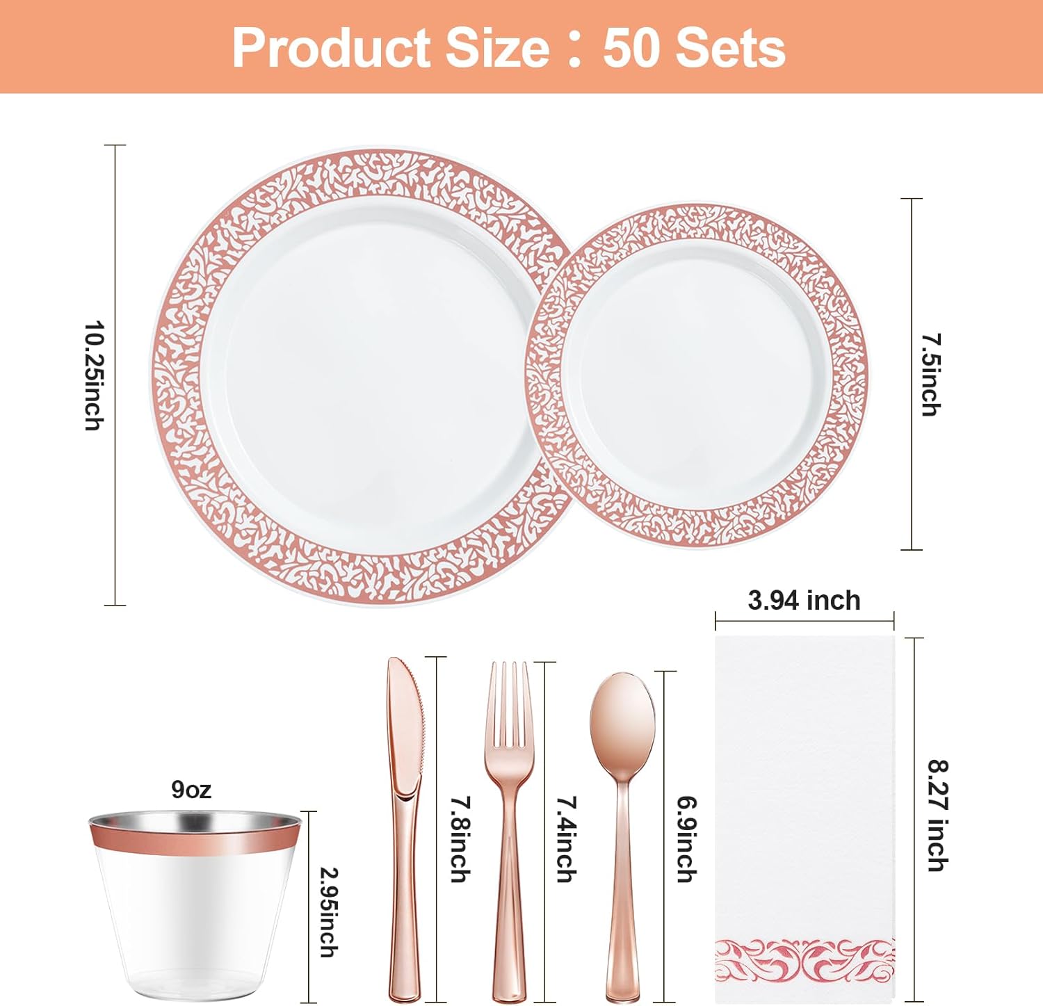 350PCS Rose Gold Plastic Dinnerware Set for 50 Guests, Disposable Plates for Party, Wedding, Include 50 Rose Gold Dinner Plates, 50 Dessert Plates, 50 Set Silverware, 50 Cups, 50 Napkins