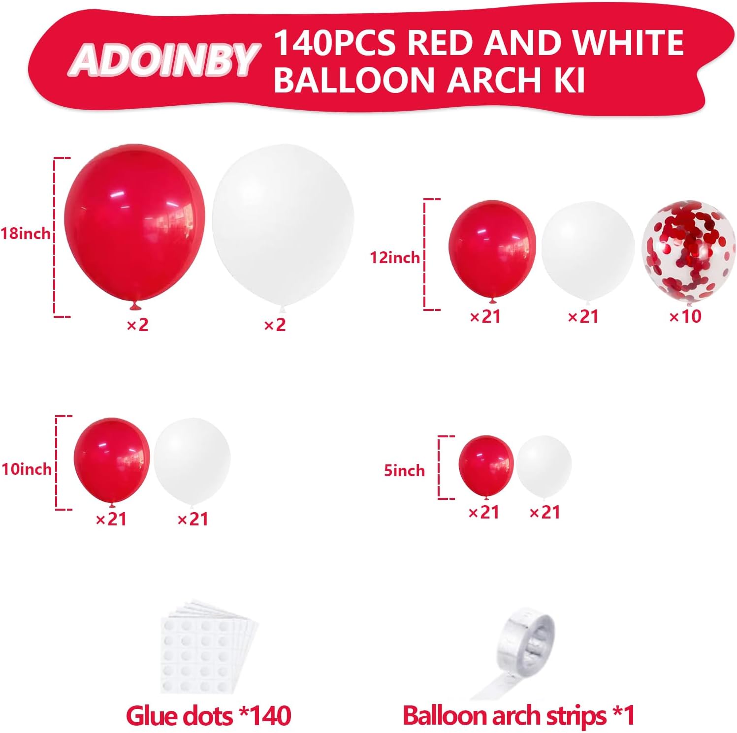 - 【Red and White Balloon Garland Kit】:Include 140pcs balloons 18''(White balloons 2, Red balloons 2),12''(White balloons 21, Red balloons 21, Red confetti Balloons 10), 10''(White balloons 21, Red balloons 21),5''(White balloons 21, Red balloons 21),16FT garland strip x1,140 dots glue.