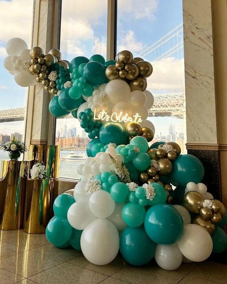 - 【Teal Balloon Garland Arch Kit】:Include 18''(Teal balloons 2, White balloons 2),12''(Teal balloons 20, White balloons 20, Metallic Gold Balloons 10, Gold confetti balloons 10), 10''(Teal balloons 18, White balloons 18, Metallic Gold Balloons 10),5''(Teal balloons 15, White balloons 15),16FT garland strip x1,140 dots glue.